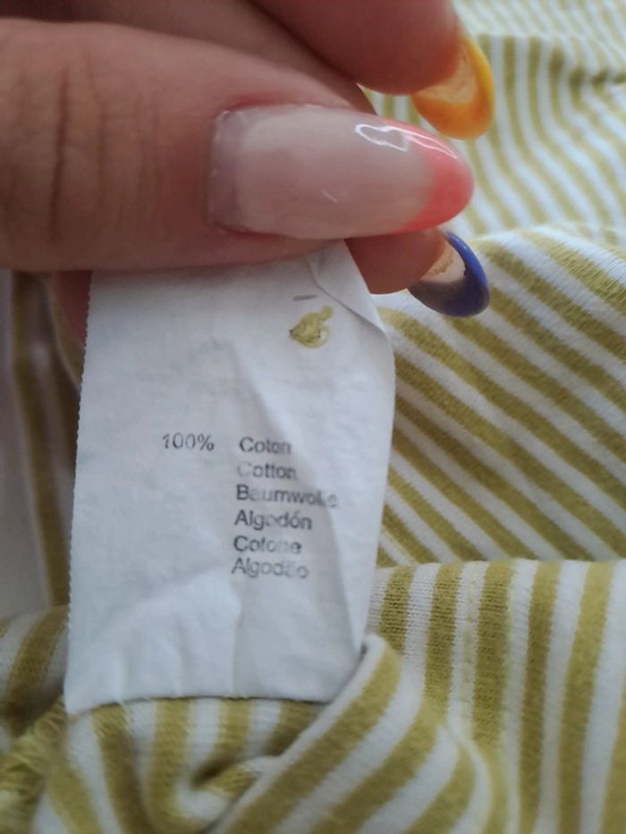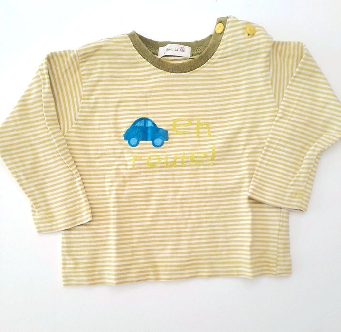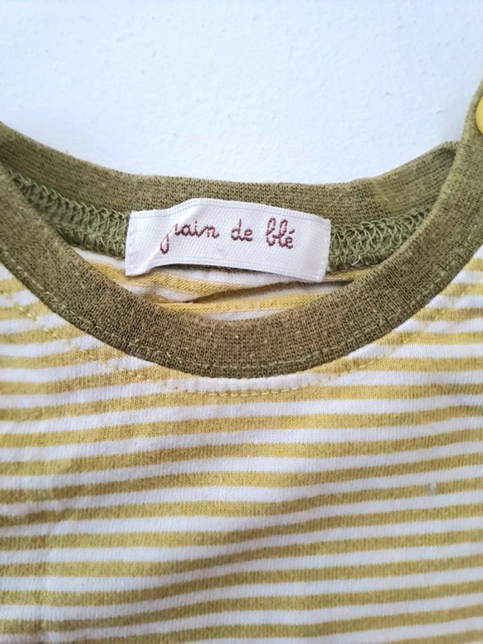 T-shirt rayé vert . Comporte un bouton de rechange Taille 12 mois Marque grain de blé En parfait état #lili7606taille1an #lili7606tshirt #lili7606graindeble #tshirtgraindeblé #tshirtrayevert #tshirtgarcon12mois #tshirtmancheslonguesgarçon