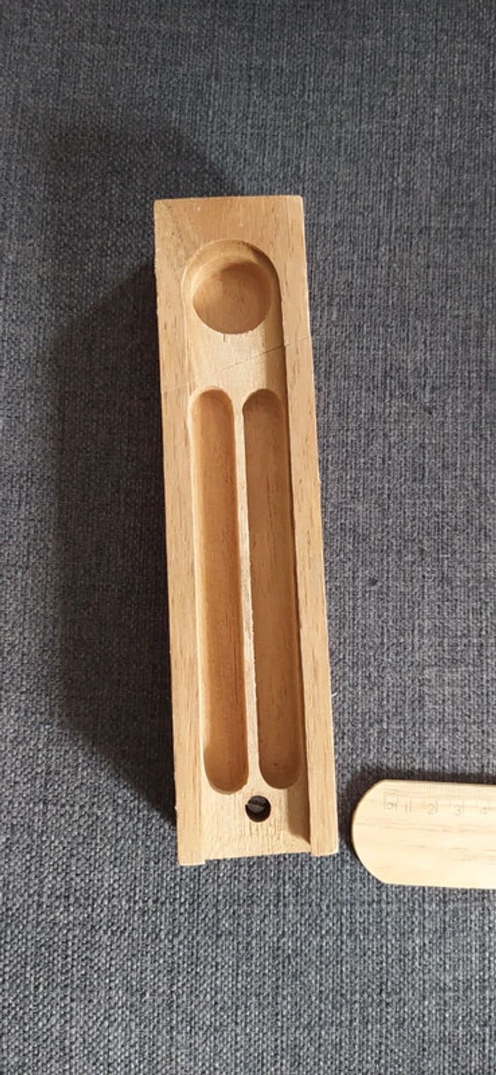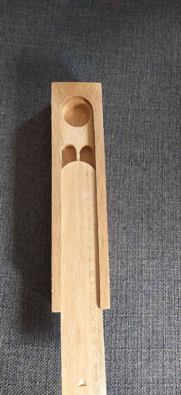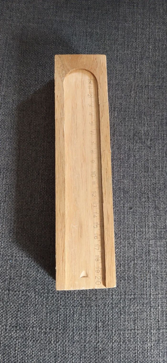 Plumier en bois avec une règle un compartiment en haut et un rangement en dessous. #plumiervintage #plumierenbois #plumier #regleenbois #règle #ecole #créationfrançaise