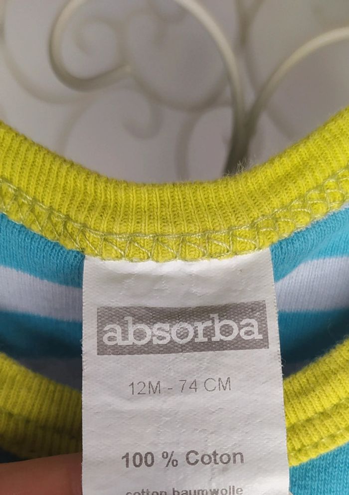 Bodie sans manches bleu blanc et vert pomme. 100% coton Taille 12 mois 74 cm Marque absorba #lili7606taille1an #lili7606ensemble #lili7606absorba #bodieabsorba12mois #bodierayee #bodiesansmanches #bodiesansmanches12mois