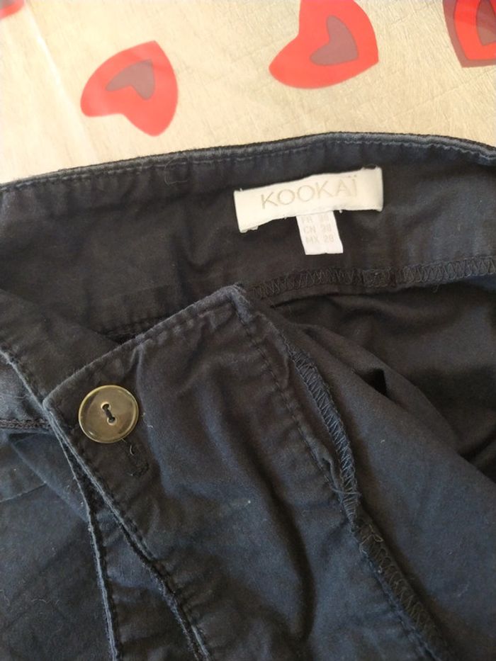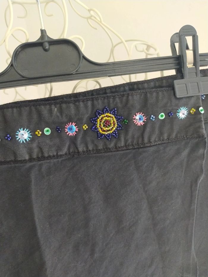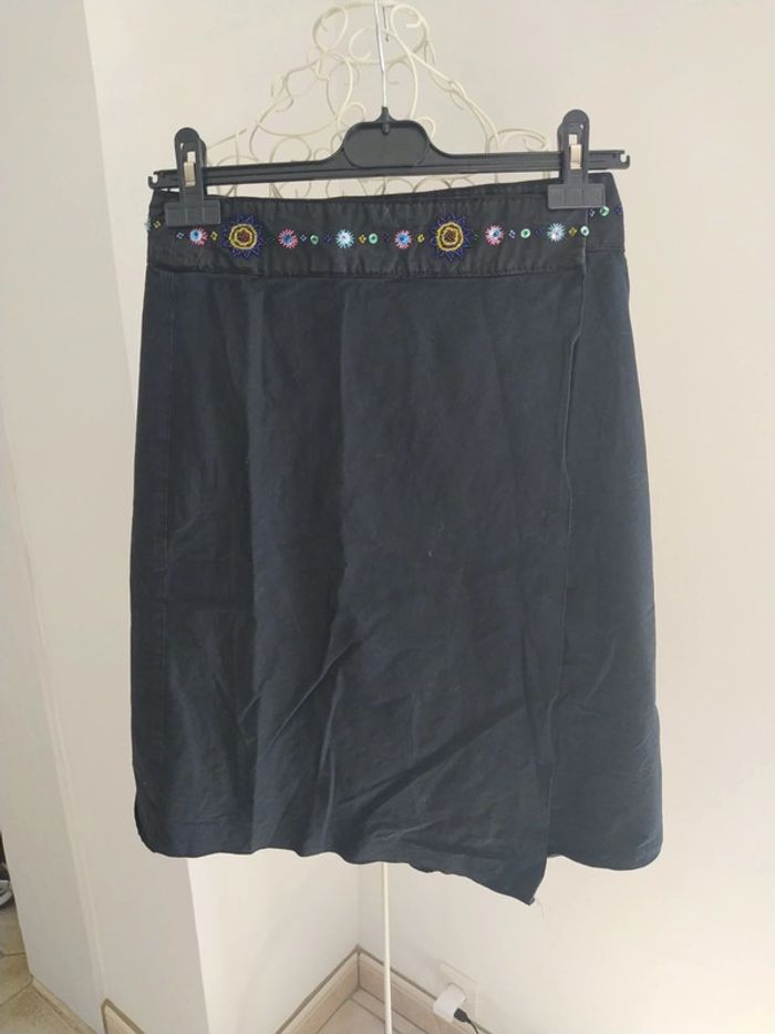 Jupe noir en coton, portefeuille qui se ferme à bouton et crochet. Jolie perles cousu. Jupe aux genoux Taille 38 Marque Kookaï #lili7606tailleM #lili7606jupe #lili7606kookai