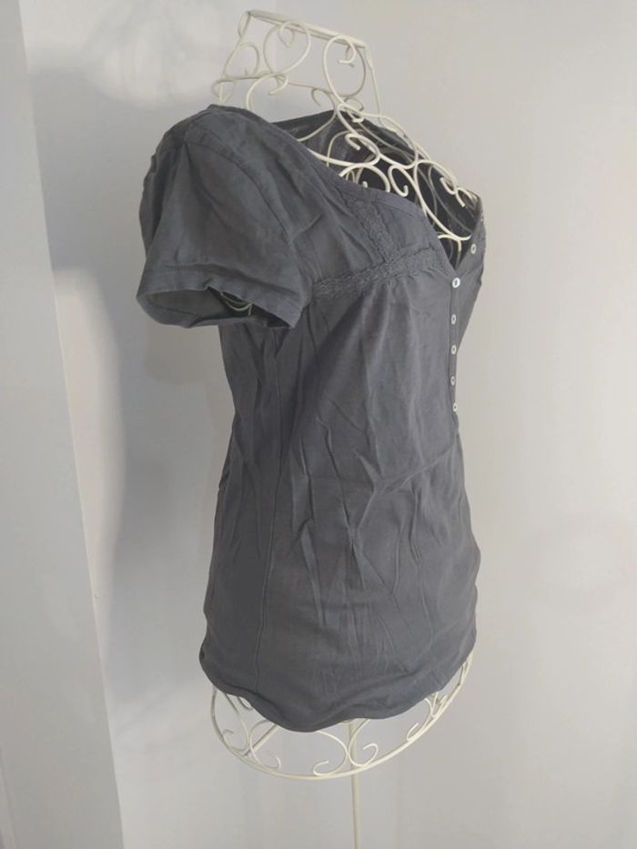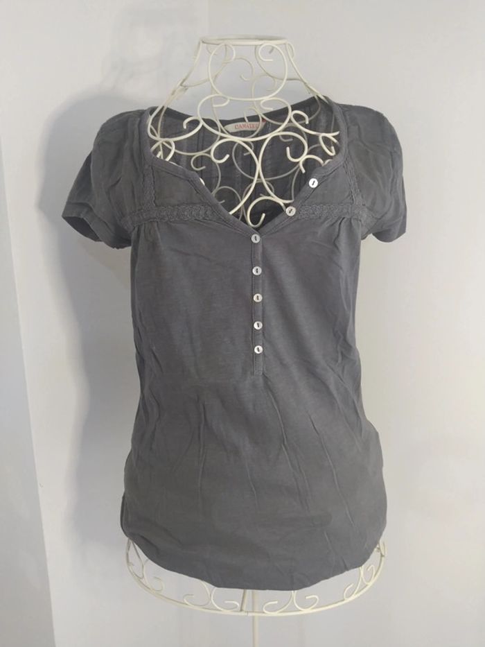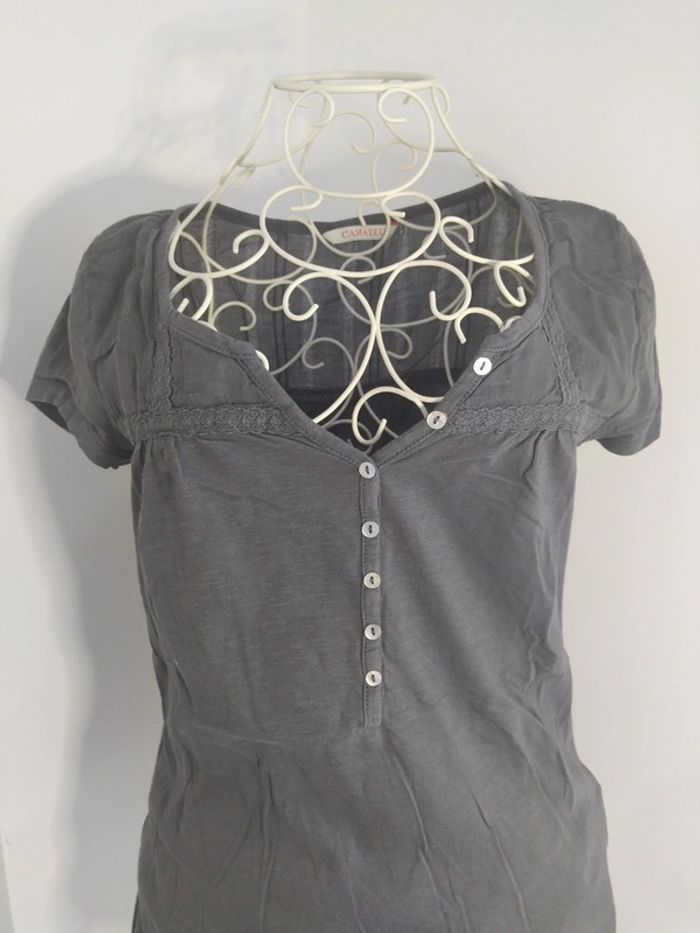 T shirt gris avec bouton + un de rechange. bas élastique. Taille XS Marque Camaïeu. #lili7606tailleXS #lili7606tshirt #lili7606camaieu