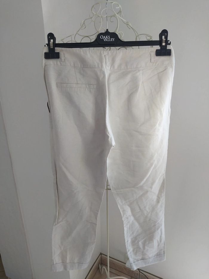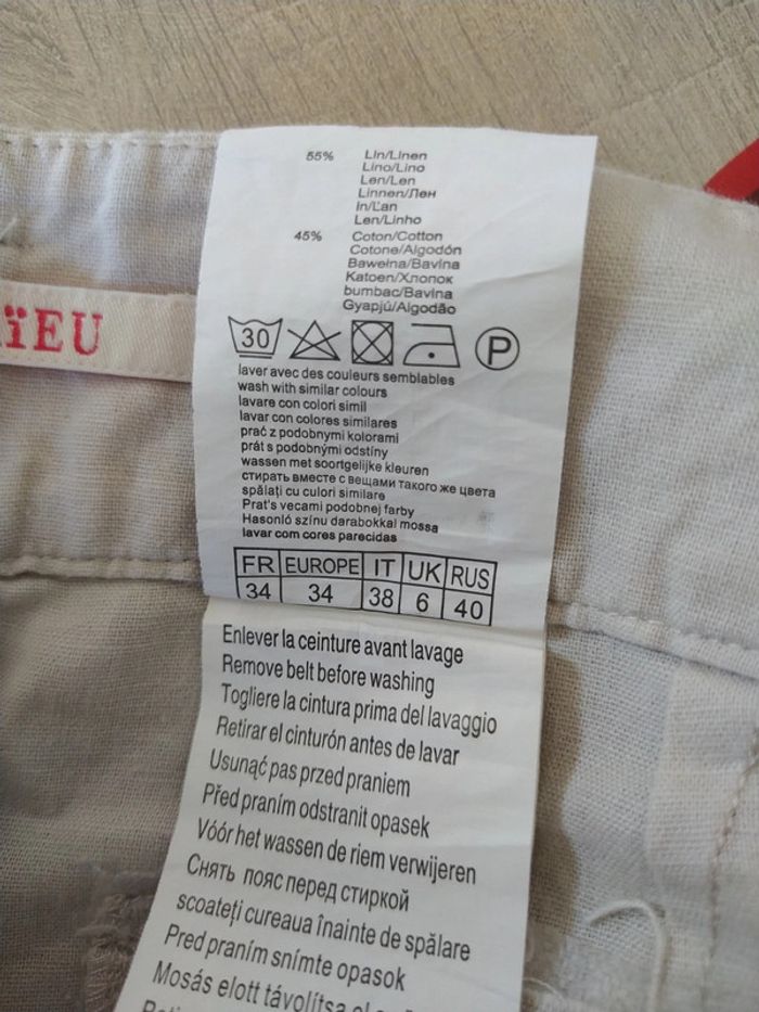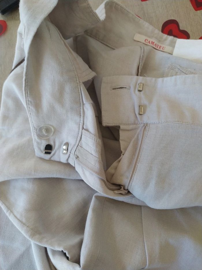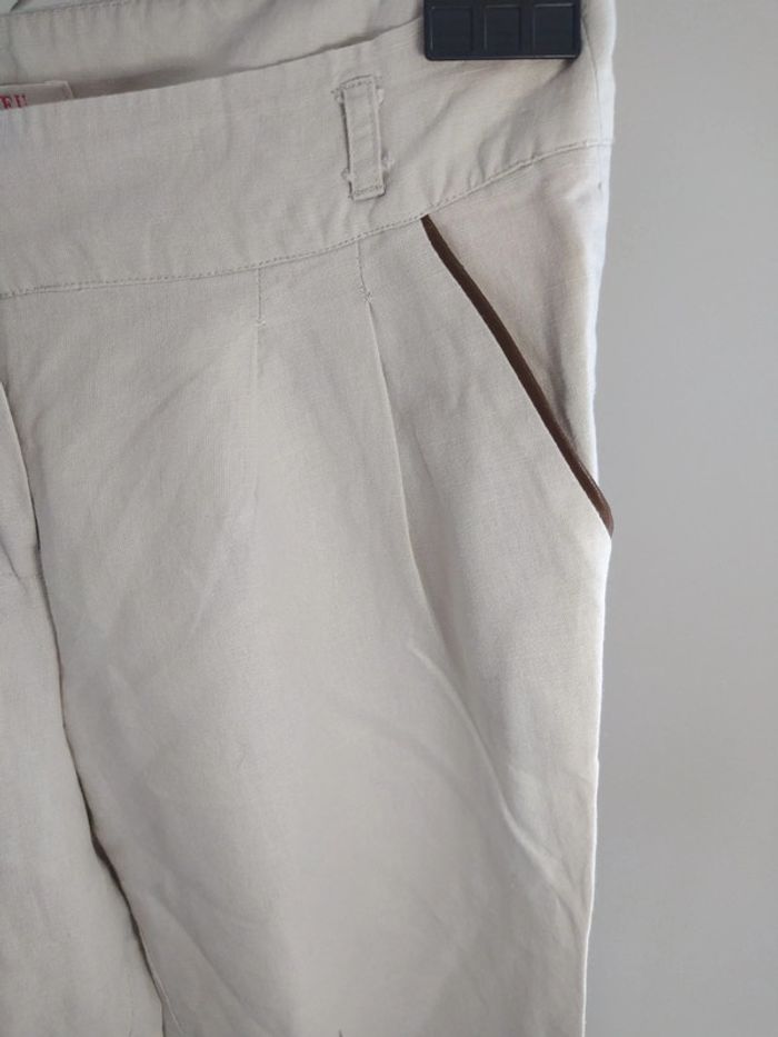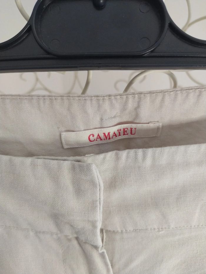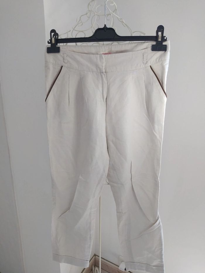 Pantalon en lin et en coton. En très bon état sans défaut. Couleur beige et poche avec rebord marron Fermeture + bouton + crochets + un bouton de rechange Taille 34 Marque Camaïeu #lili7606tailleXS #lili7606pantalon #lili7606camaieu