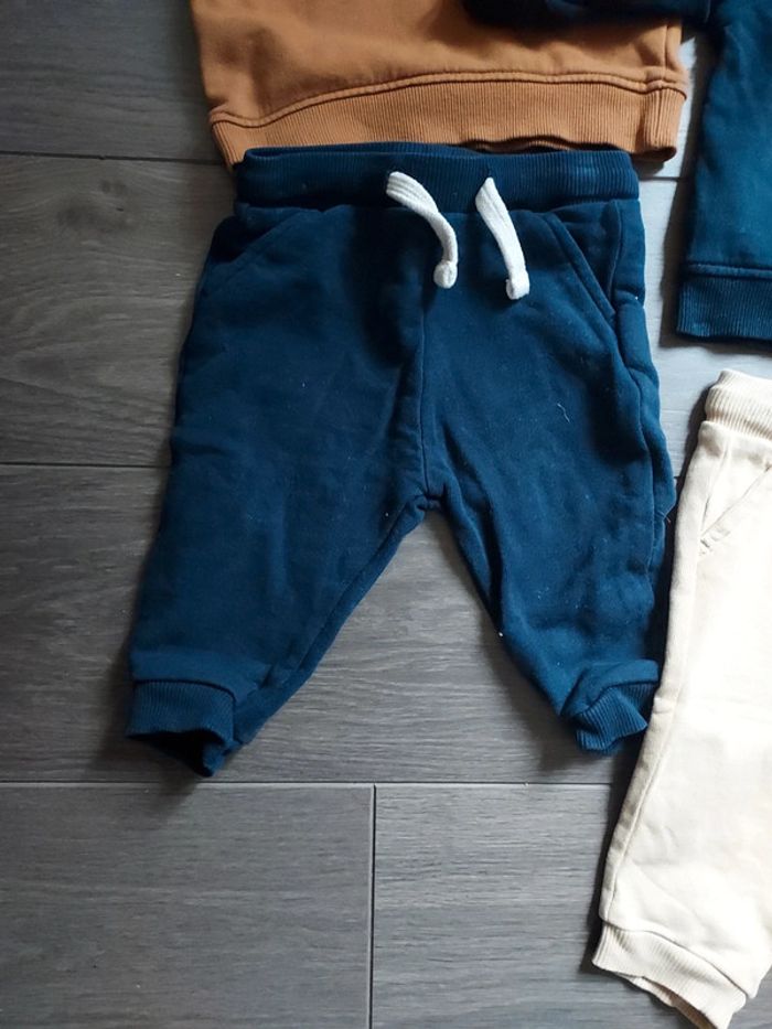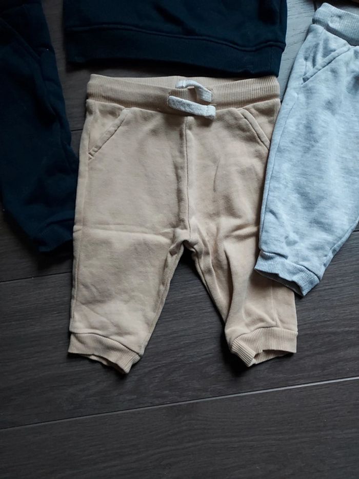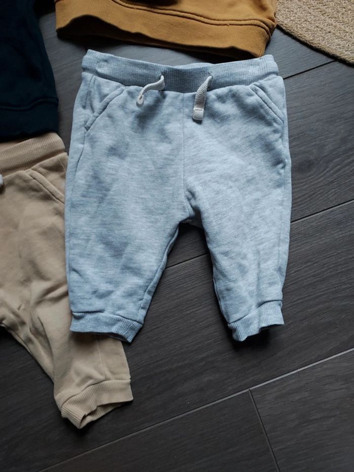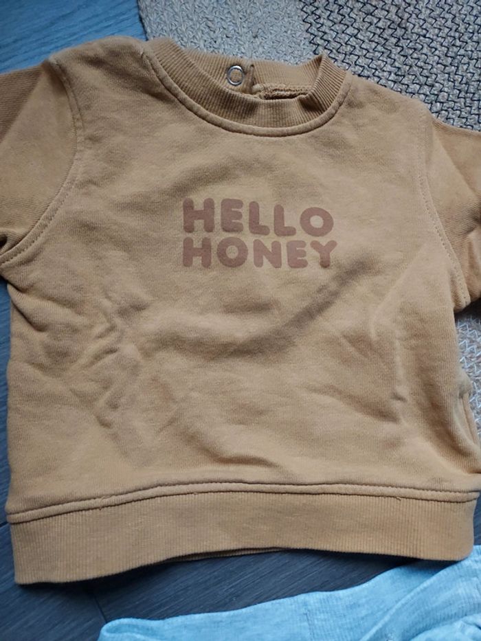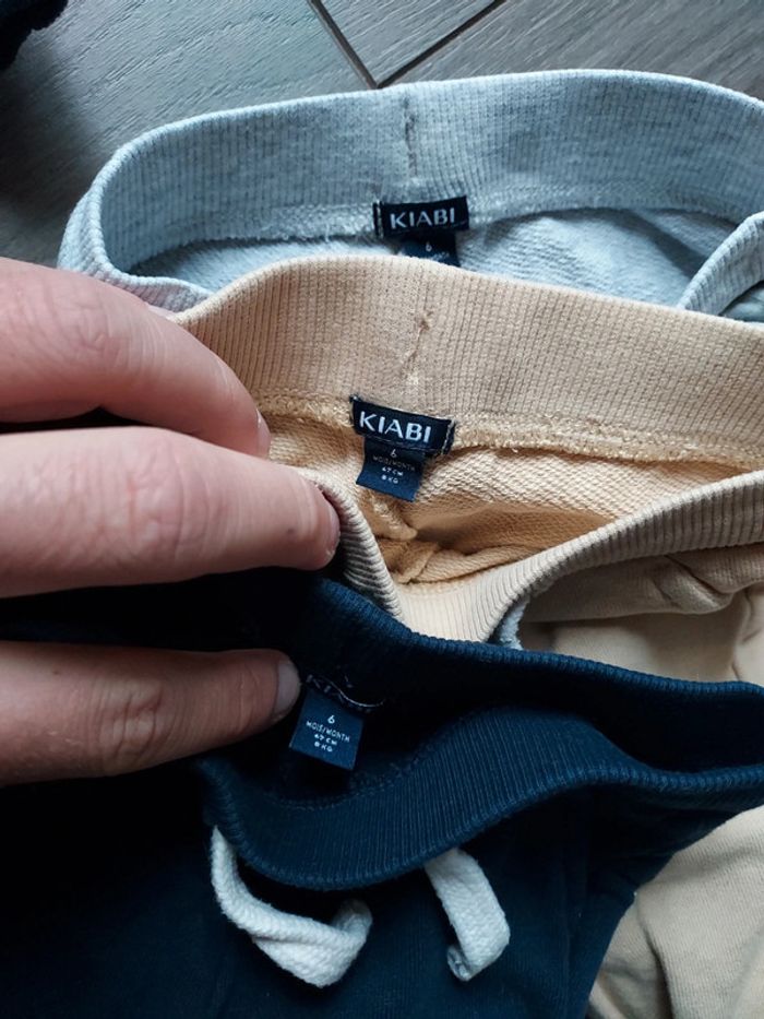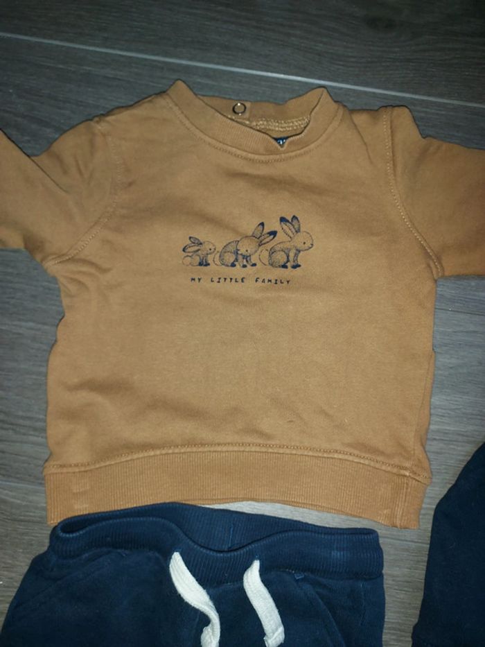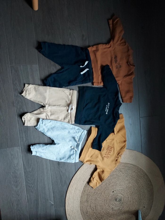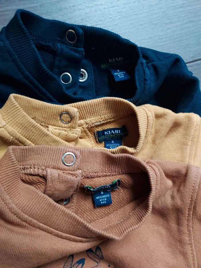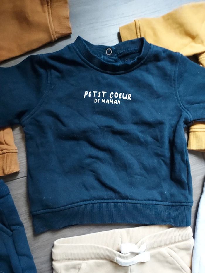 3 ensembles Kiabi 6 mois Très bon état 3 pantalons type jogging (marine, gris, beige) 3 sweats : - 1 marine "petit cœur de maman" - 1 moutarde "hello honey" - 1 marron "my little family"