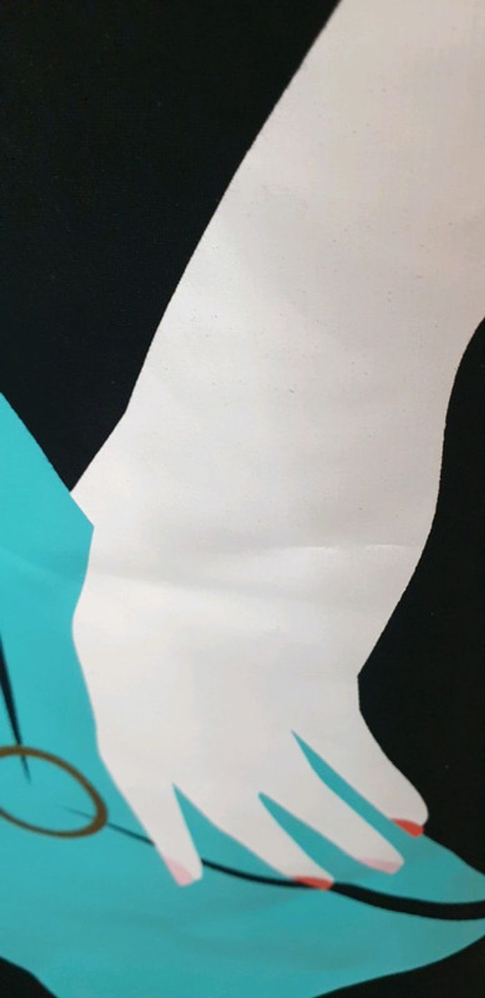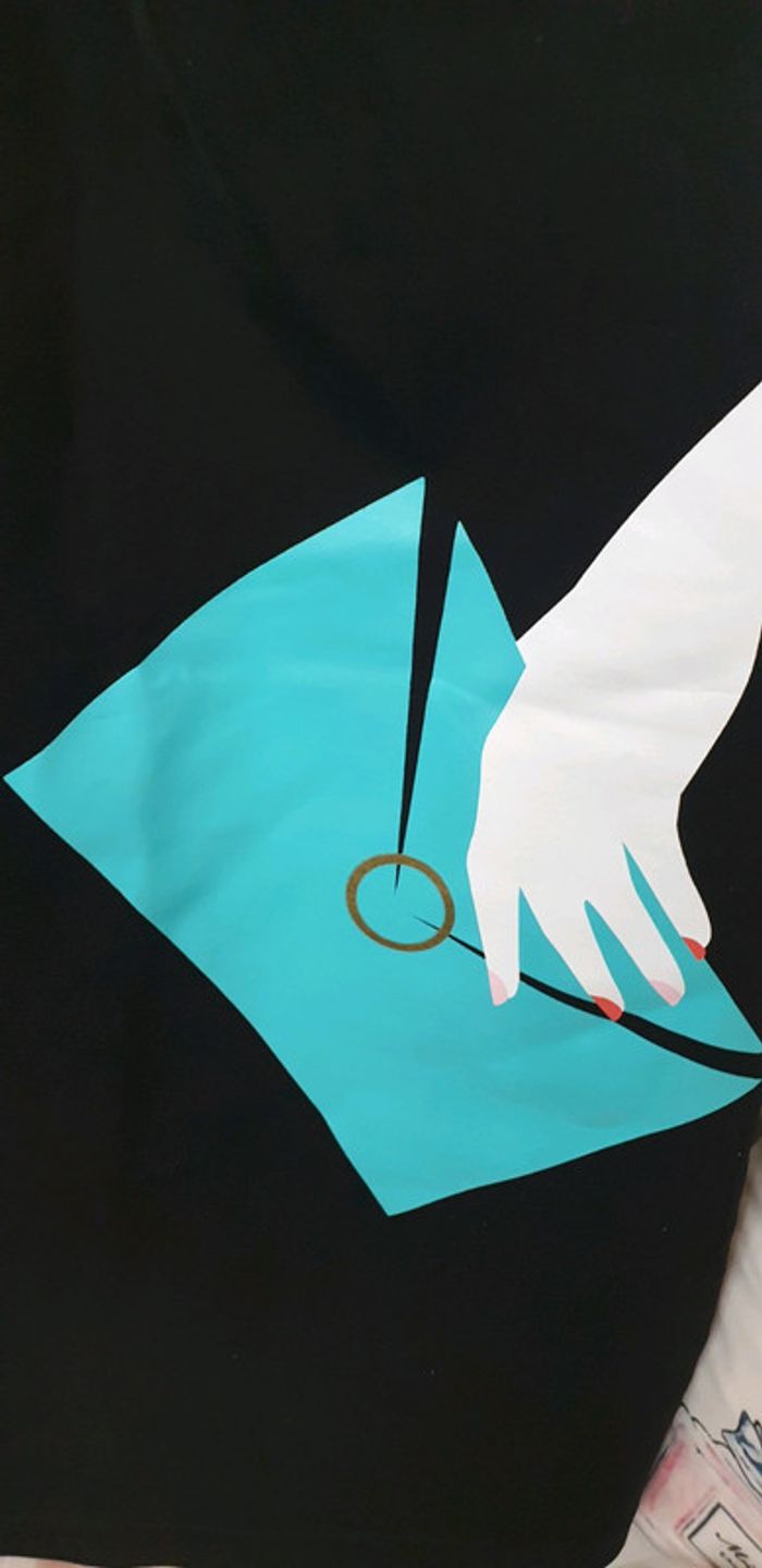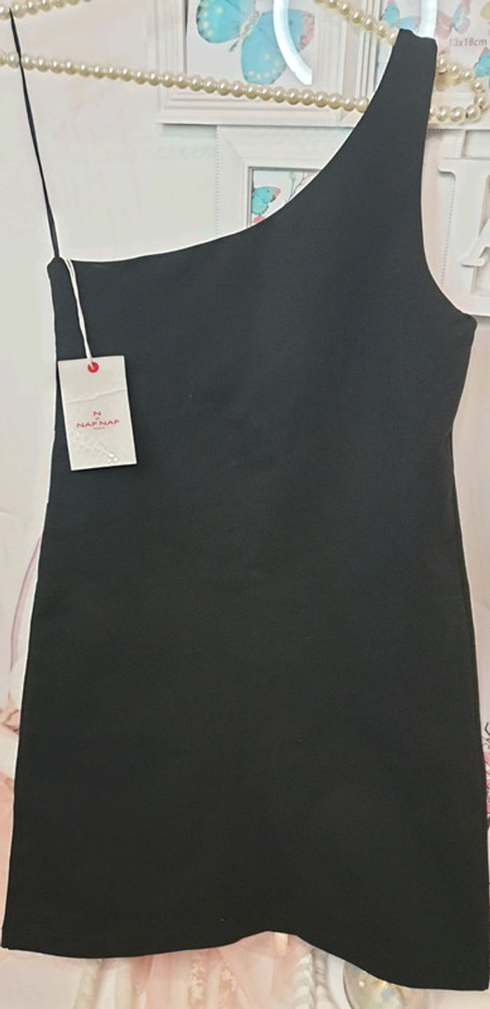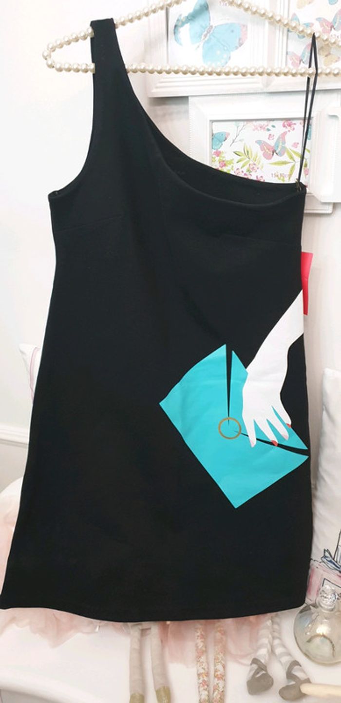 Bonjour je vous propose cette robe noire avec décor main de femme tenant une pochette très chic et original matière élastique taille 36 de la marque N By Naf Naf