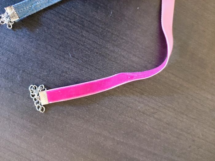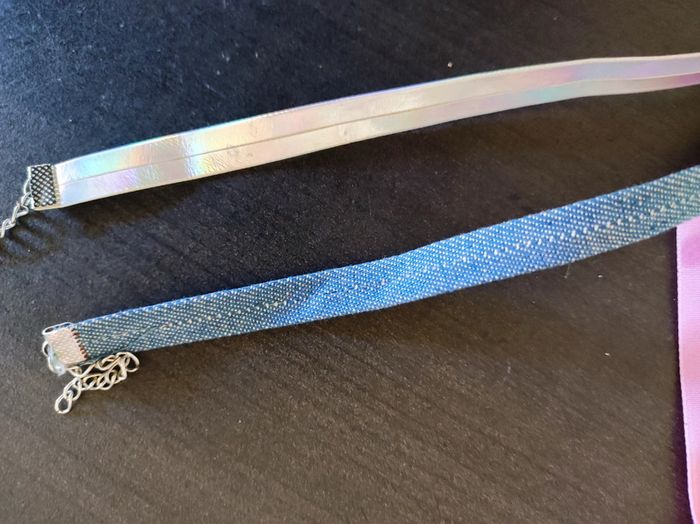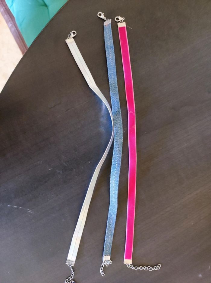 3 collier ras du coup Un en effet cuir argent , un en jean et un velours rose. Très bon état #tweety024BIJOUX #tweety024LOT