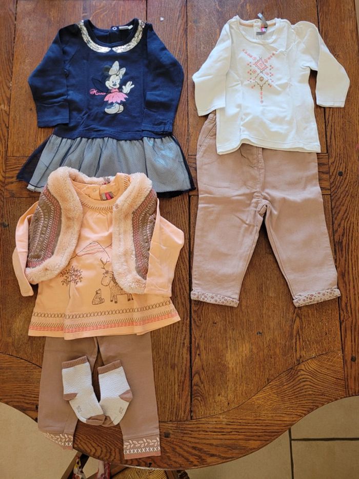 Vends 2 ensembles + 1 robe 1 robe manches longues Minnie DIsney 1 ensemble Orchestra avec t shirt manches longues blanc et pantalons marron 1 ensemble Orchestra avec t shirt manches longues abricot, un leggings marron, 1 veste sans manche polaire et une paire de chaussettes 19/22 20€ le lot