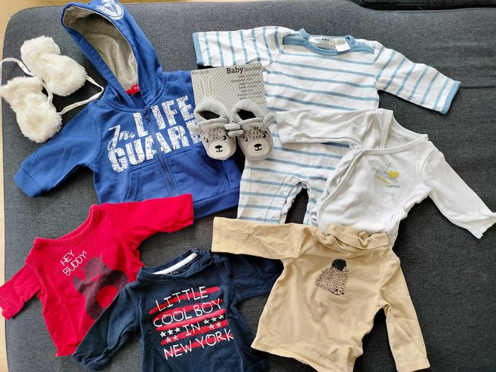 - 1 gilet zippé - 3 tee shirts manches longues - 1 combinaison - 1 body - 1 paire de chaussons - 1 paire de moufles