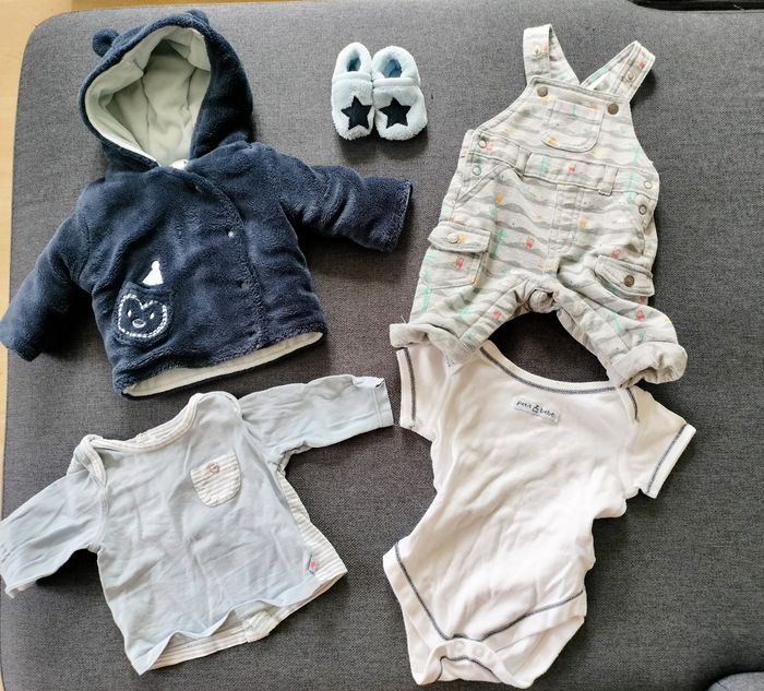 - 1 veste (0mois) - 1 salopette (1mois) - 1 tee shirt - 1 body - 1 paire de chaussons - 2 bavoirs