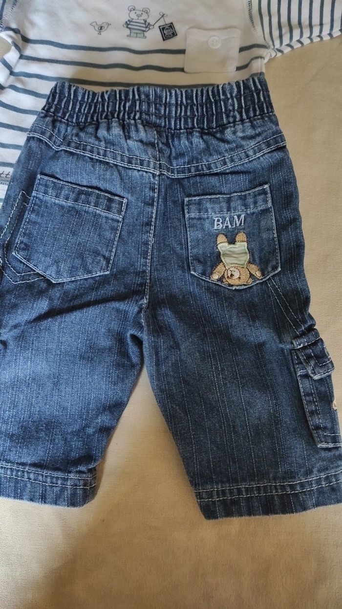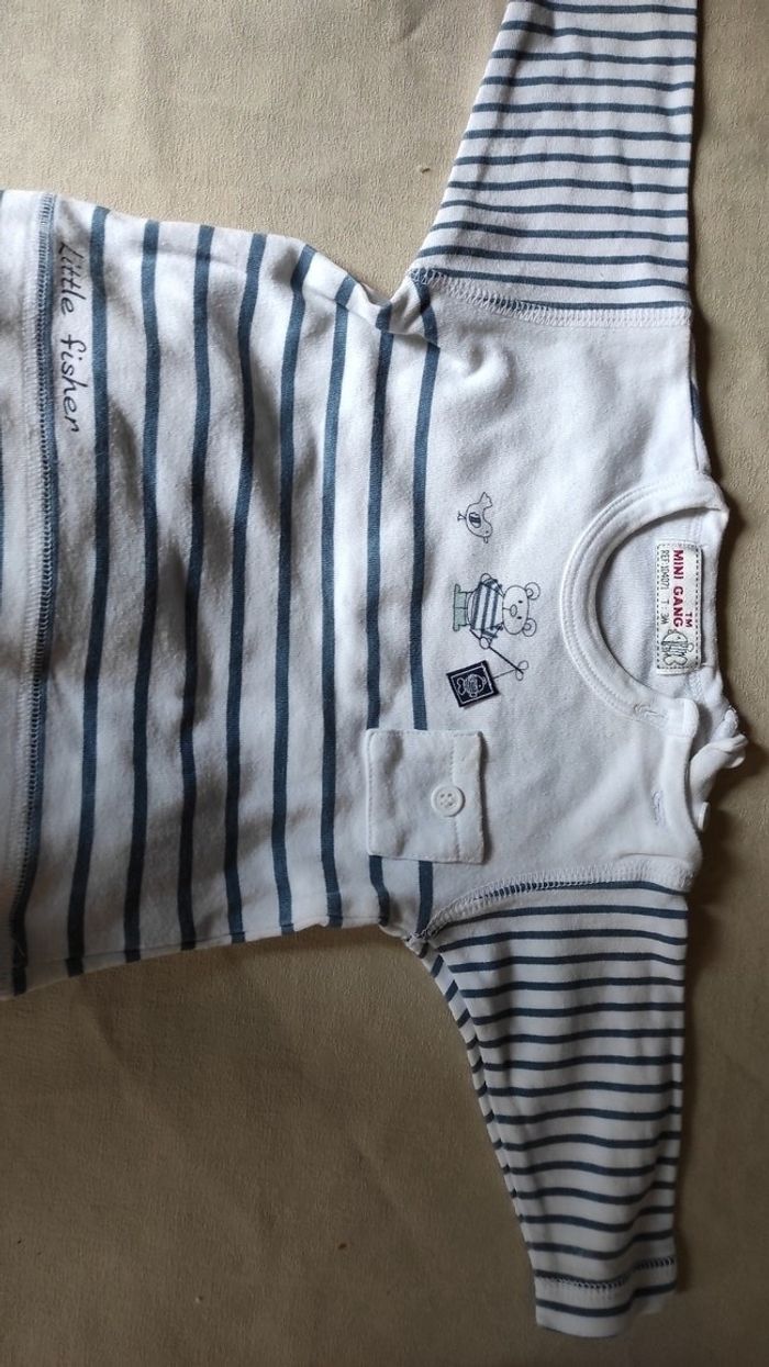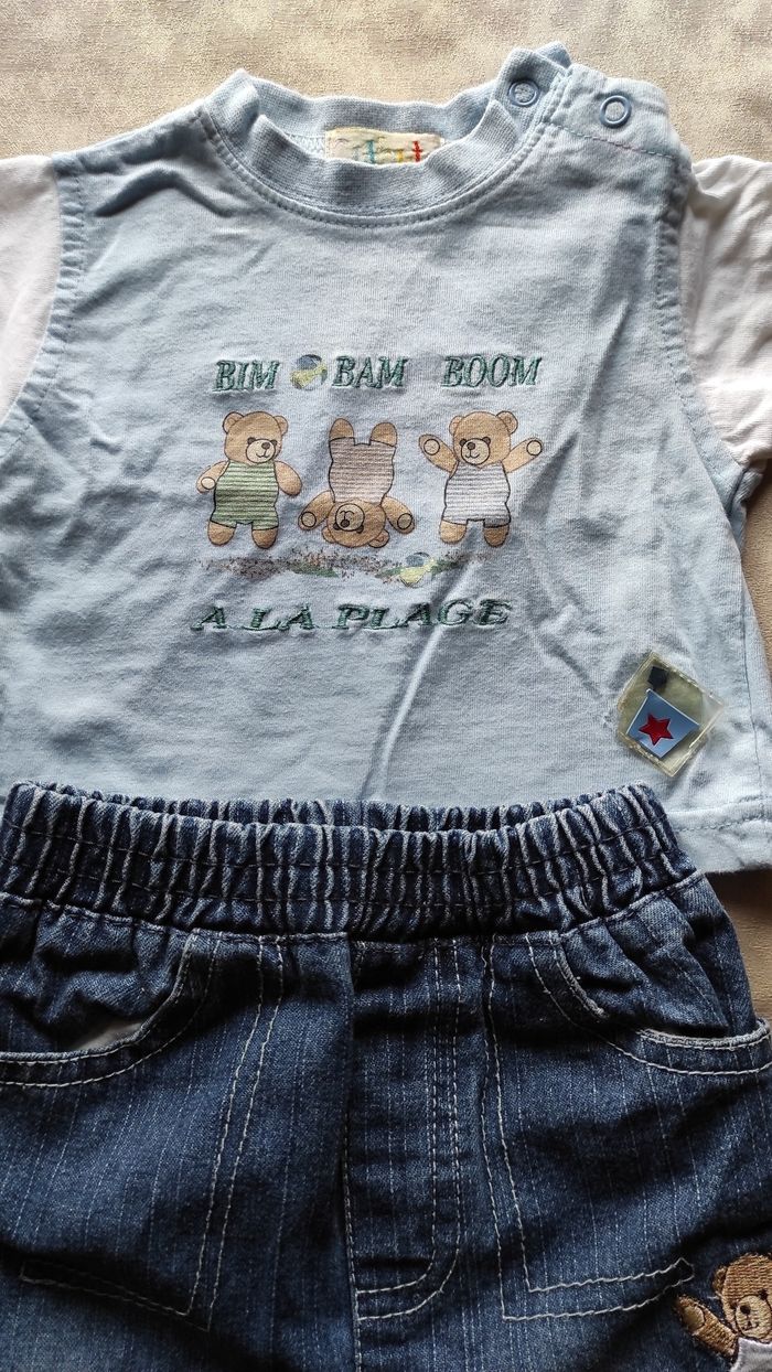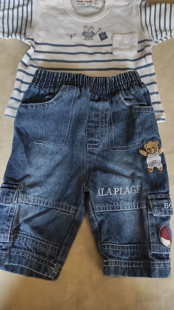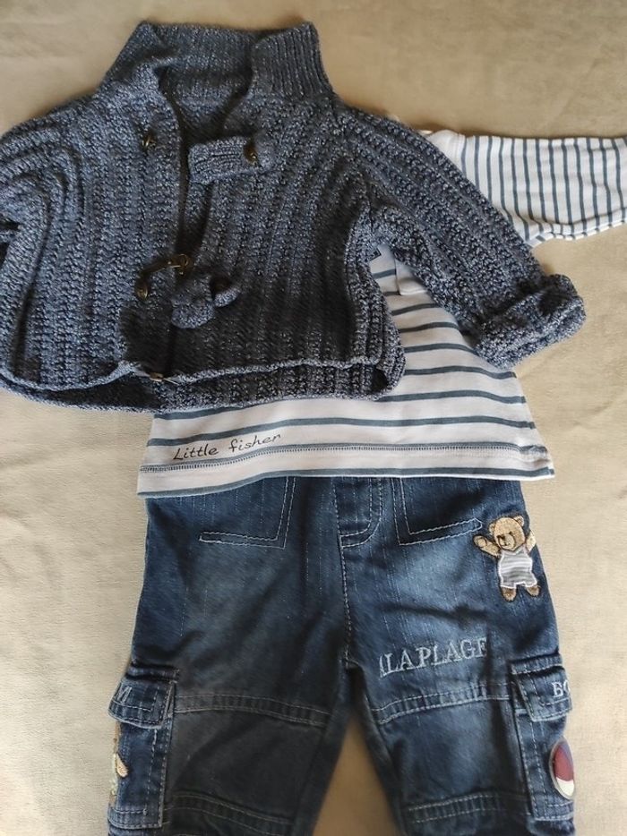 Joli petit ensemble avec gilet torsadé bleu, jean Culbuto petit ourson et tee shirt manches longues marinière avec petit ourson marque mini gang. Plus un tee shirt manches courtes Culbuto avec un petit motif plastique seau un peu abimé. Très bon état général