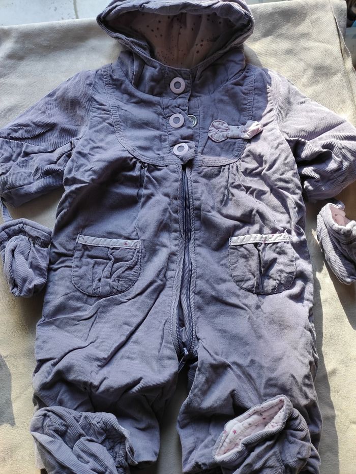 Très jolie combinaison doudoune violette rose velours bien chaude avec gants et chaussons accrochés avec boutons pressions. Fermeture éclair et 3 boutons pressions à l'avant. Capuche. très bon état tape