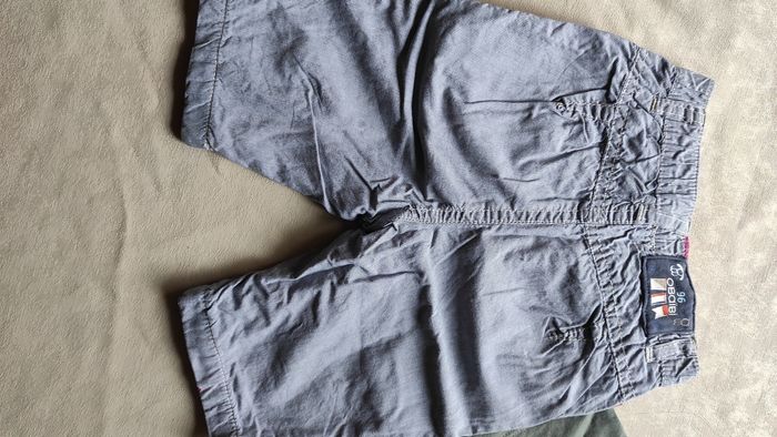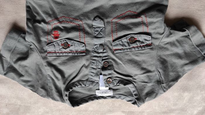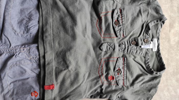 Joli ensemble pantalon à rayures blanches et bleues très fines taille élastique et tee shirt chemise kaki orange manches courtes. Très bon état