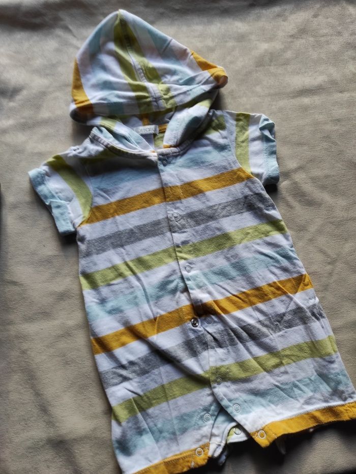 Joli combinaison été à rayures avec capuches. Manches et jambes courtes. 100% coton . Très bon état
