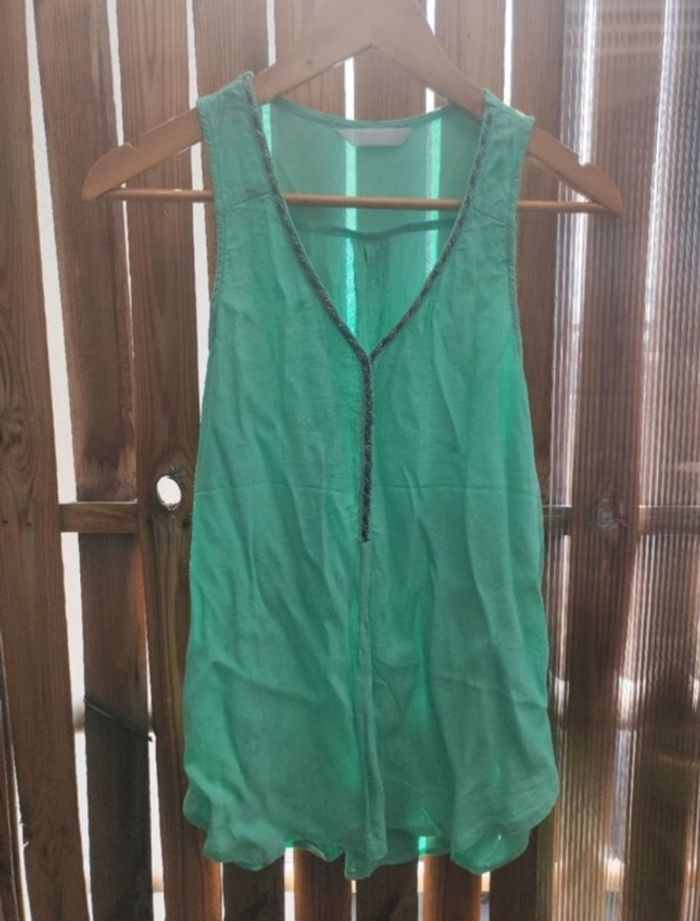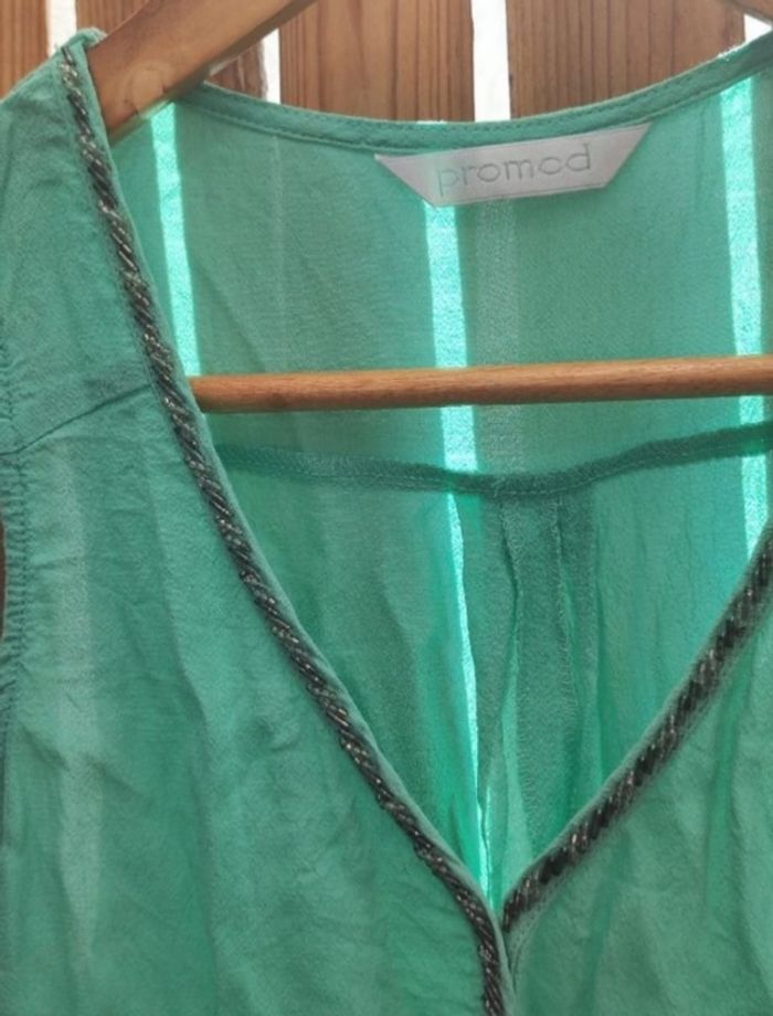 Chemisier sans manches à col V, bordure perler de chez promod en taille 38 et de couleur vert