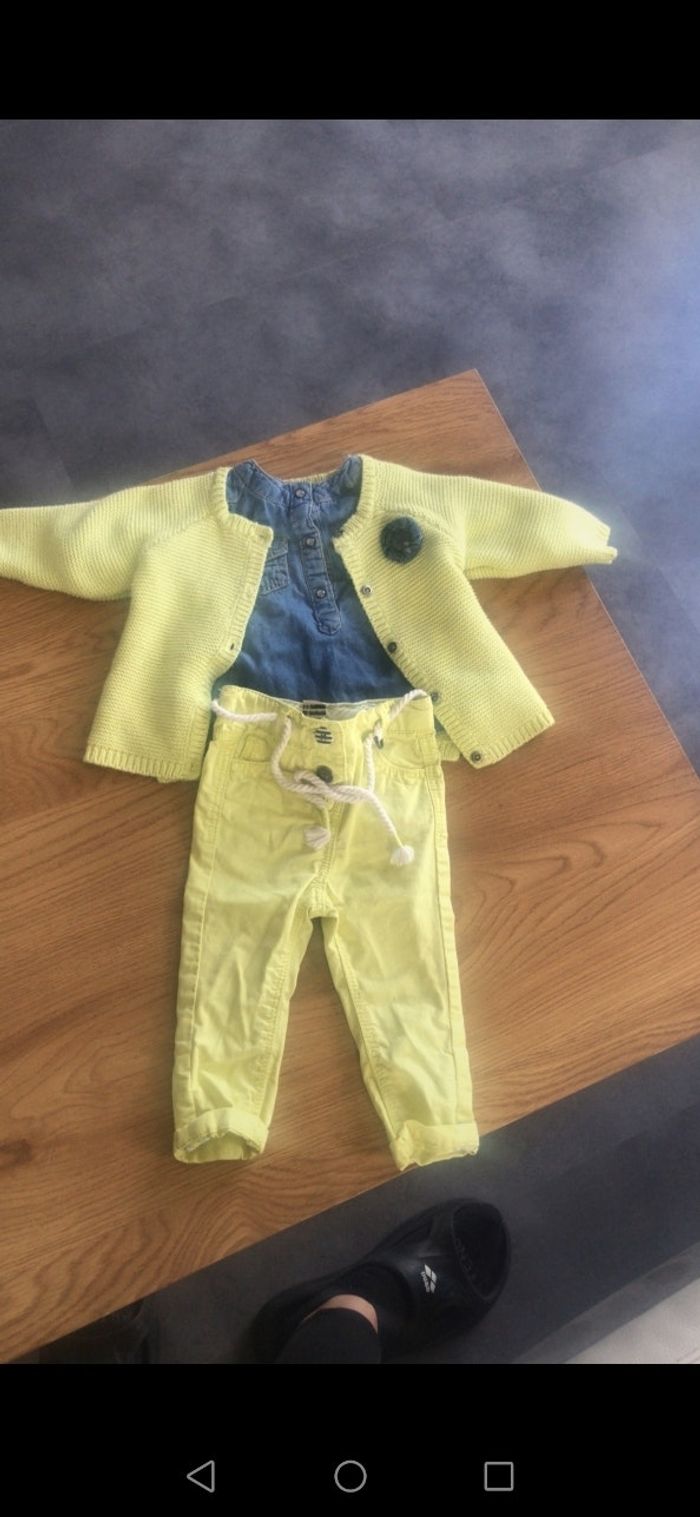Ensemble tape à l'oeil pantalon et gilet jaune taille 3 mois. Parfait état Chemise en jeans Kiabi taille 1 mois