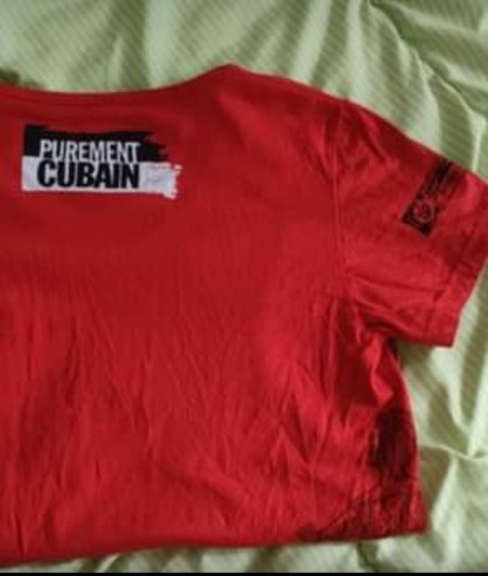 T-shirt rouge, c'est un beau rouge pas comme si on la photo parce que mon appareil photo est de mauvaise qualité t-shirt en très bon état encolure en V 100 % coton taille M Il taille légèrement petit