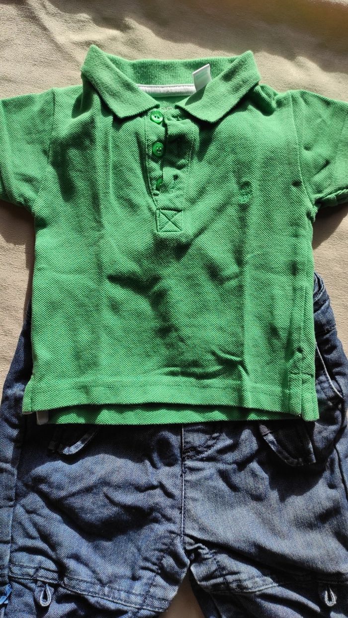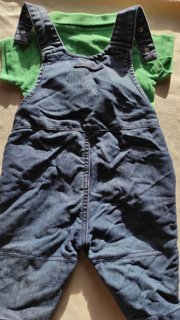 Ensemble salopette en jean et polo vert manches courtes en très bon état.