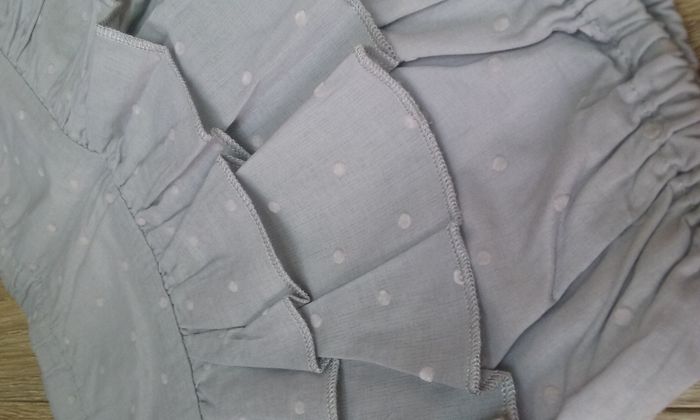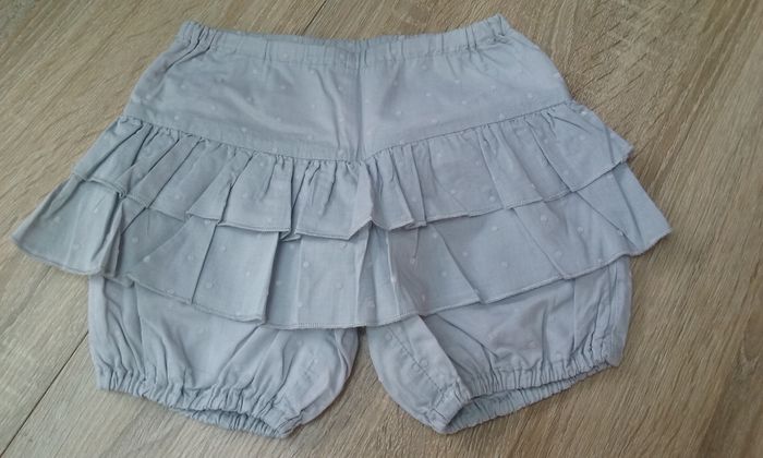 Short à volants, gris à petits pois vieux rose.. 23 mois, doublé intérieur rose pâle . Très bon état.