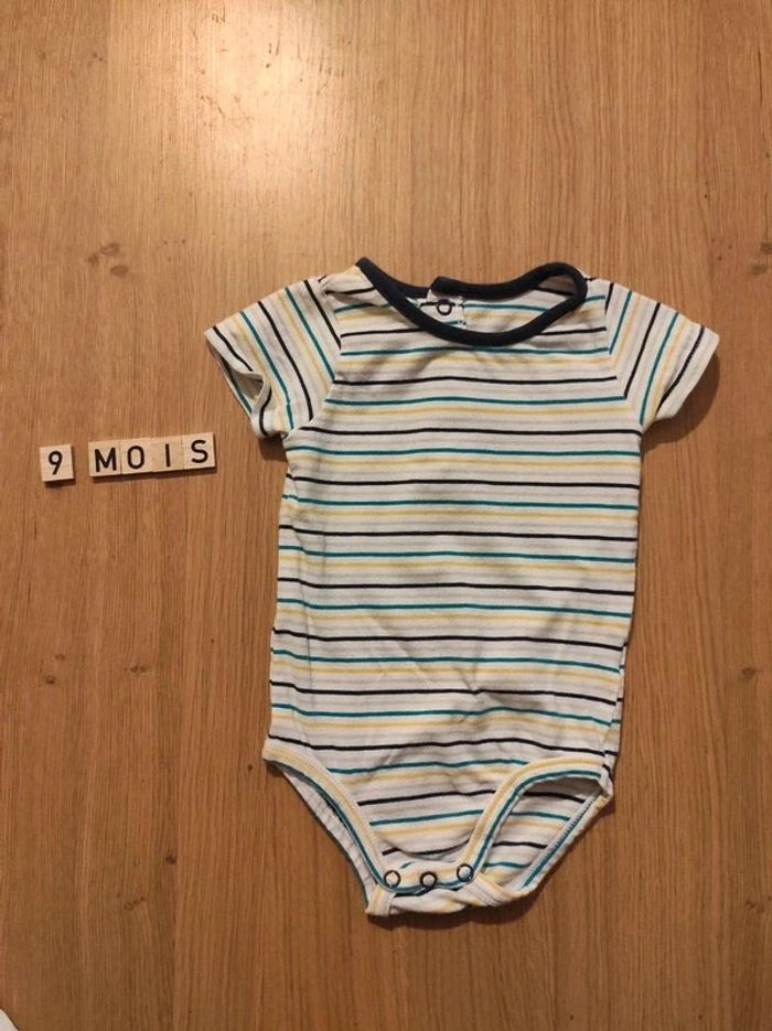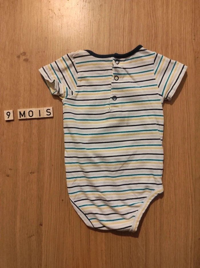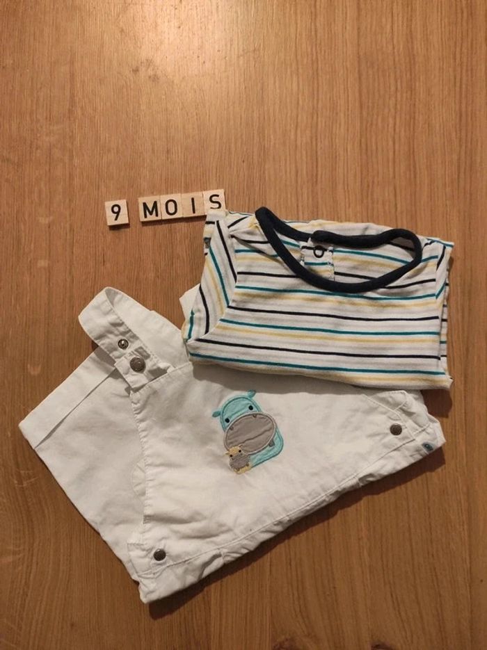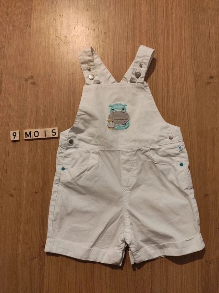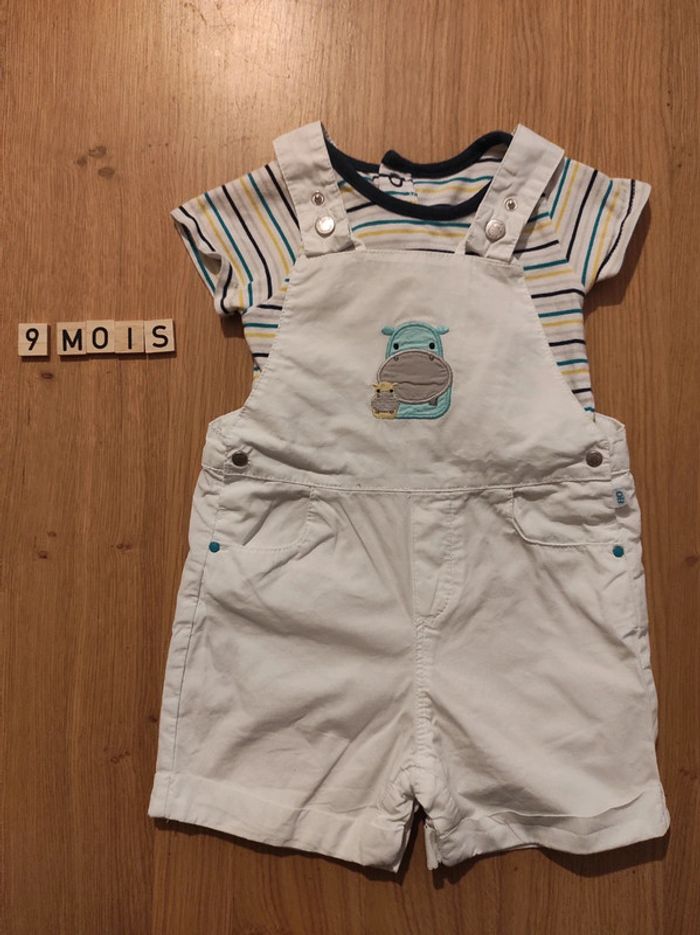 Ensemble Obaïbi en taille 9 mois-71 cm, en parfait état comprenant : Une salopette blanche en coton, ouverture à l'entrejambe par pressions Un body à manches courtes à rayures assorti.