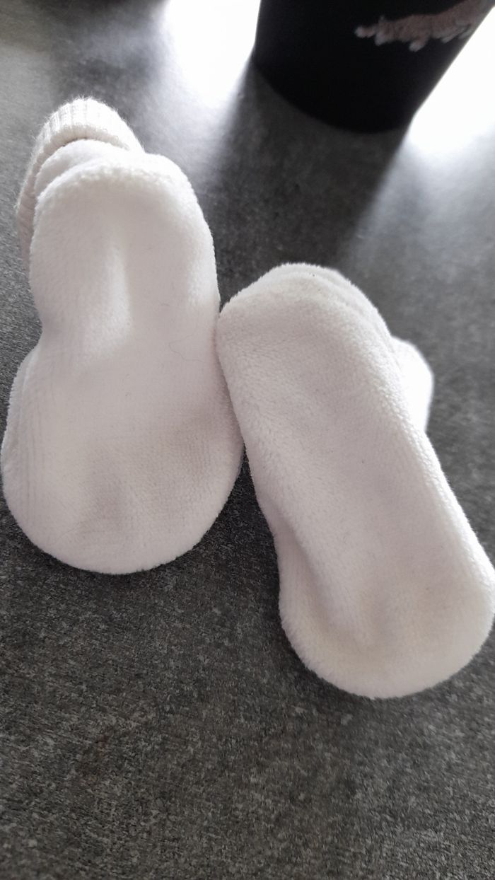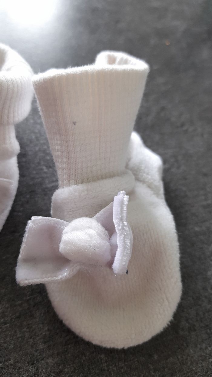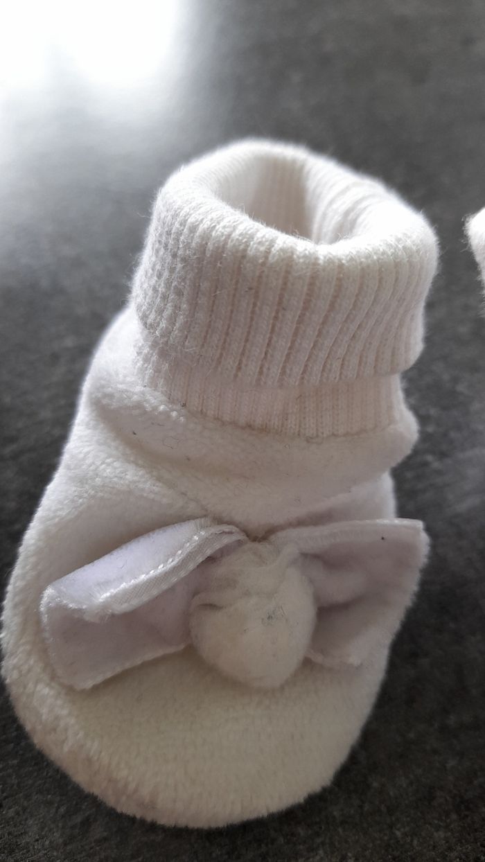 Chaussons bébé, mixte de couleur blanc. Longueur 7,5 cm en très bon état avec nœud sur le dessus.