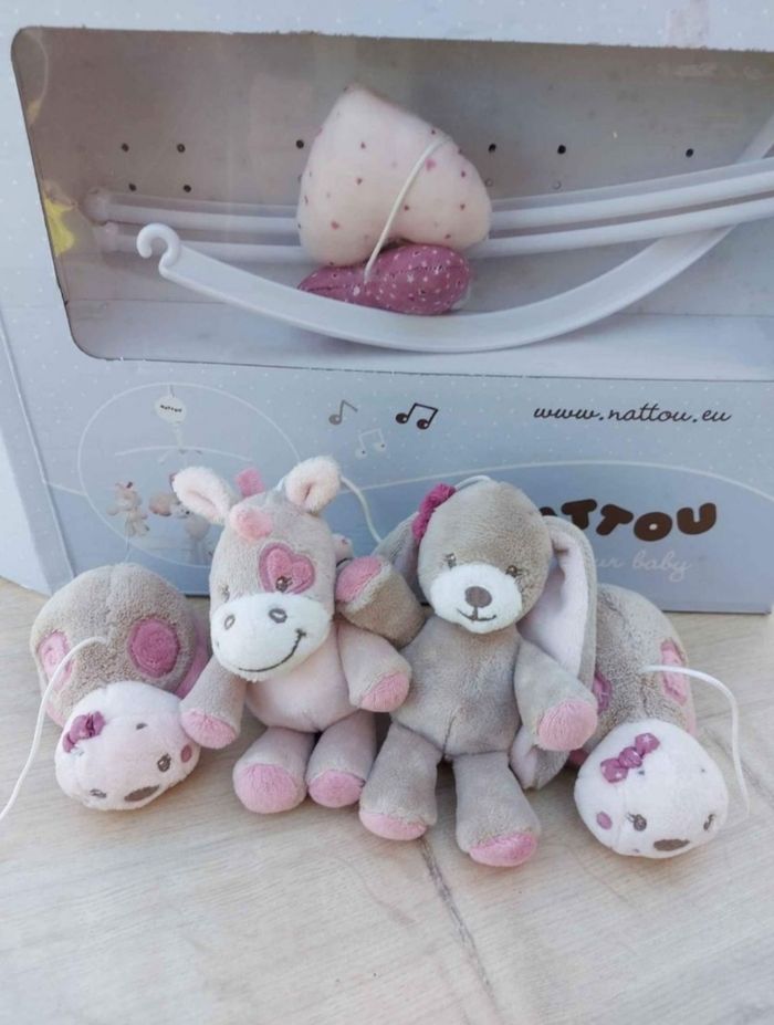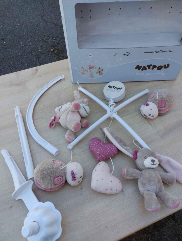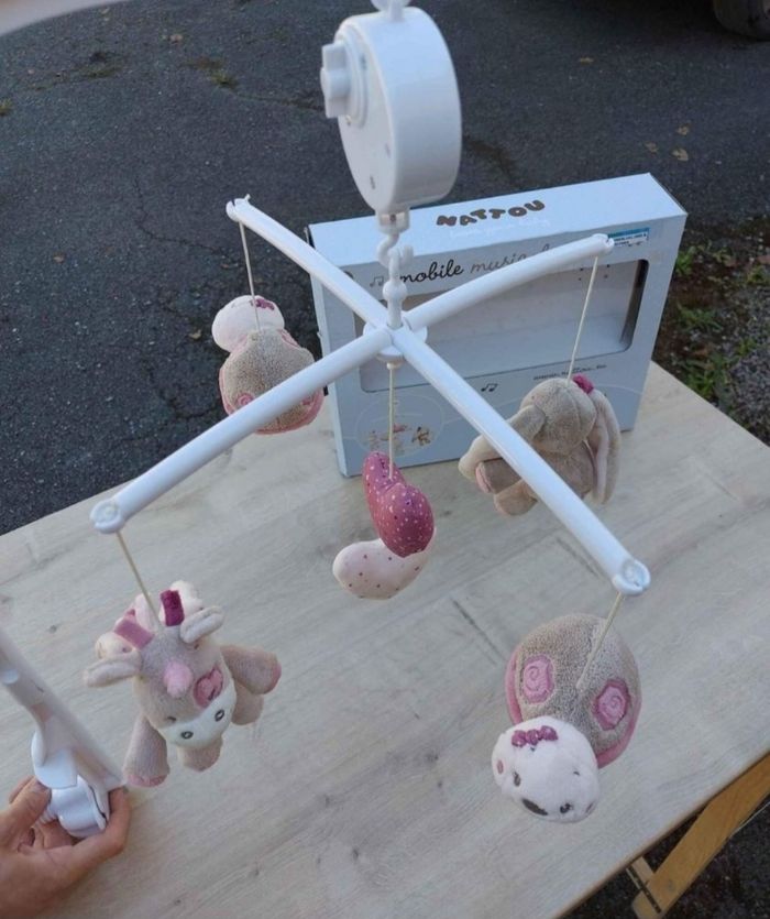 Mobile de marque Nattou, complet avec boîte. Le bout d'une barre est fendue (voir photo), mais n'empêche pas le bon fonctionnement du mobile.