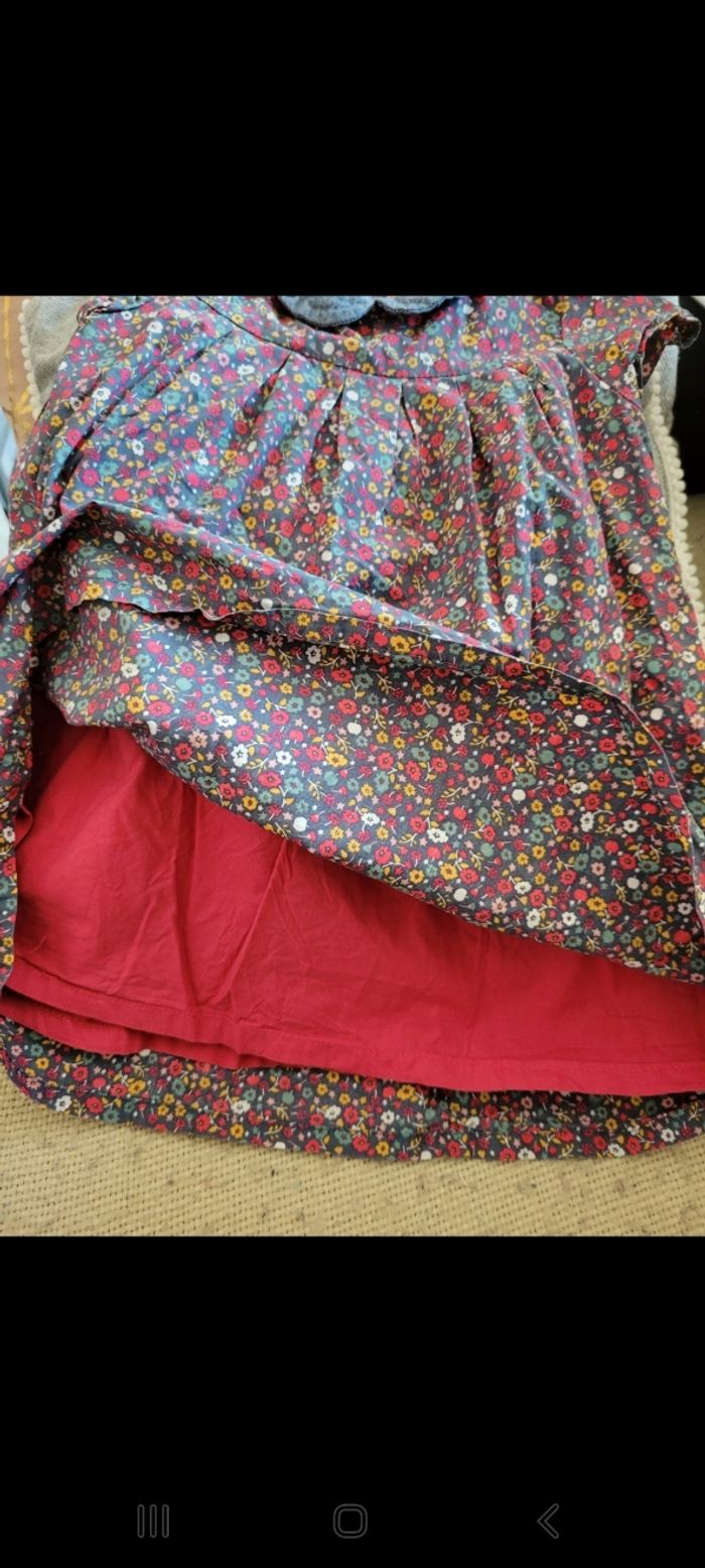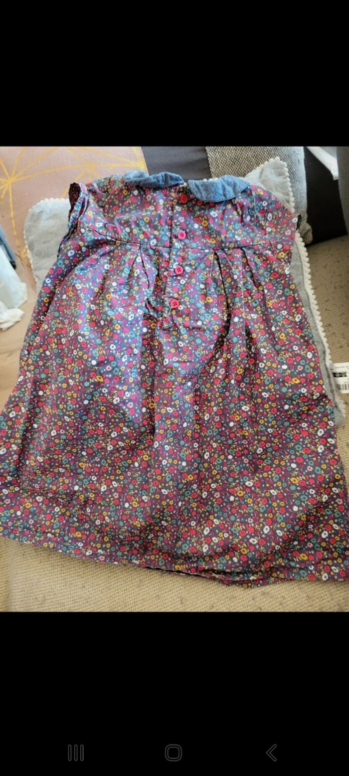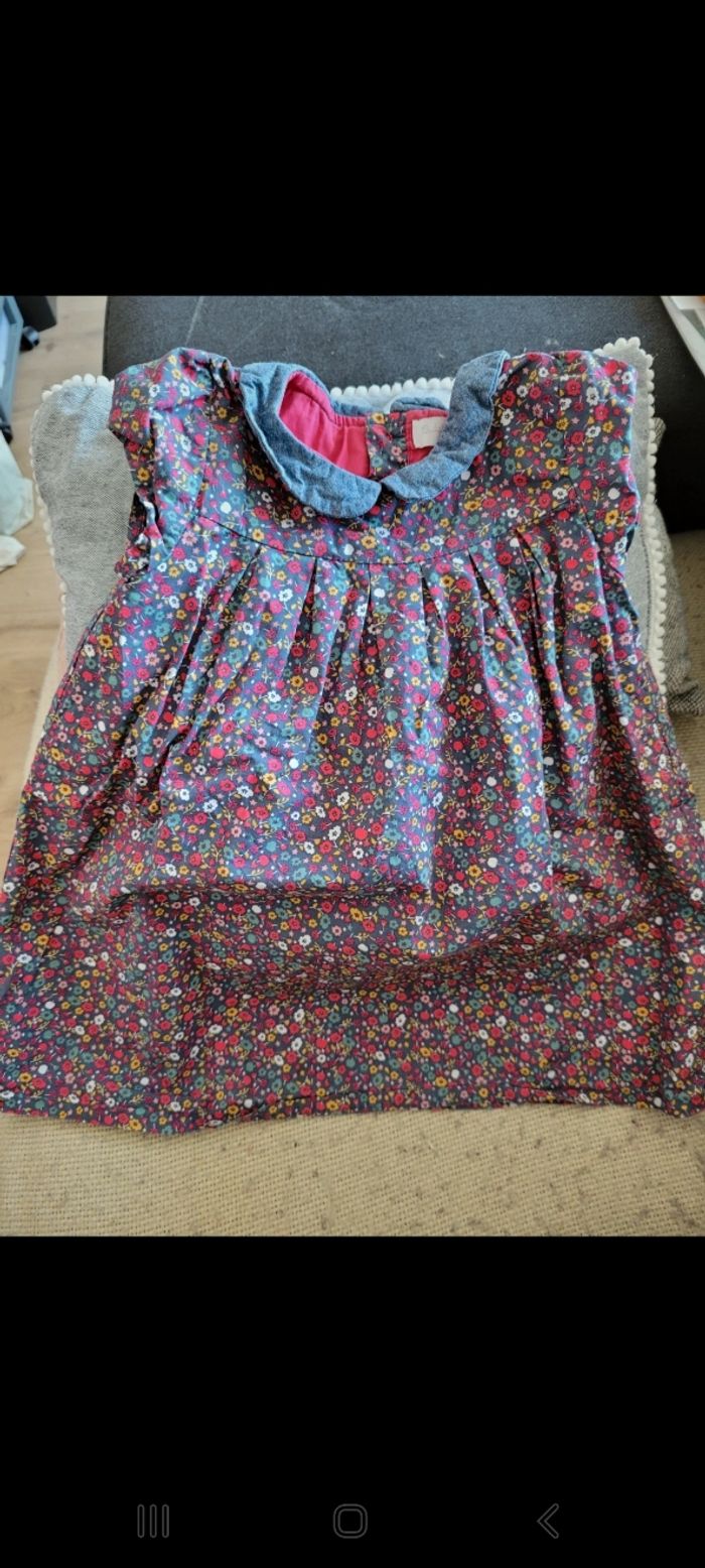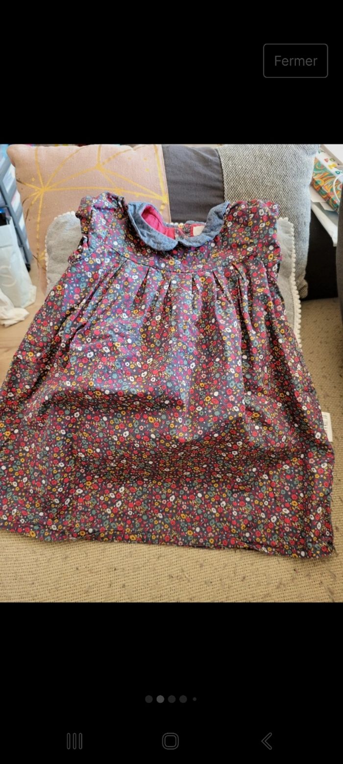 Robe longue fleurie avec un petit col. Fermeture par boutons à l'arrière. Style liberty. Elle est doublée (tissu rose). Taille 24 mois (mes filles l'ont facilement portée jusqu'à leurs 3 ans). Elle est vraiment bien conservée.