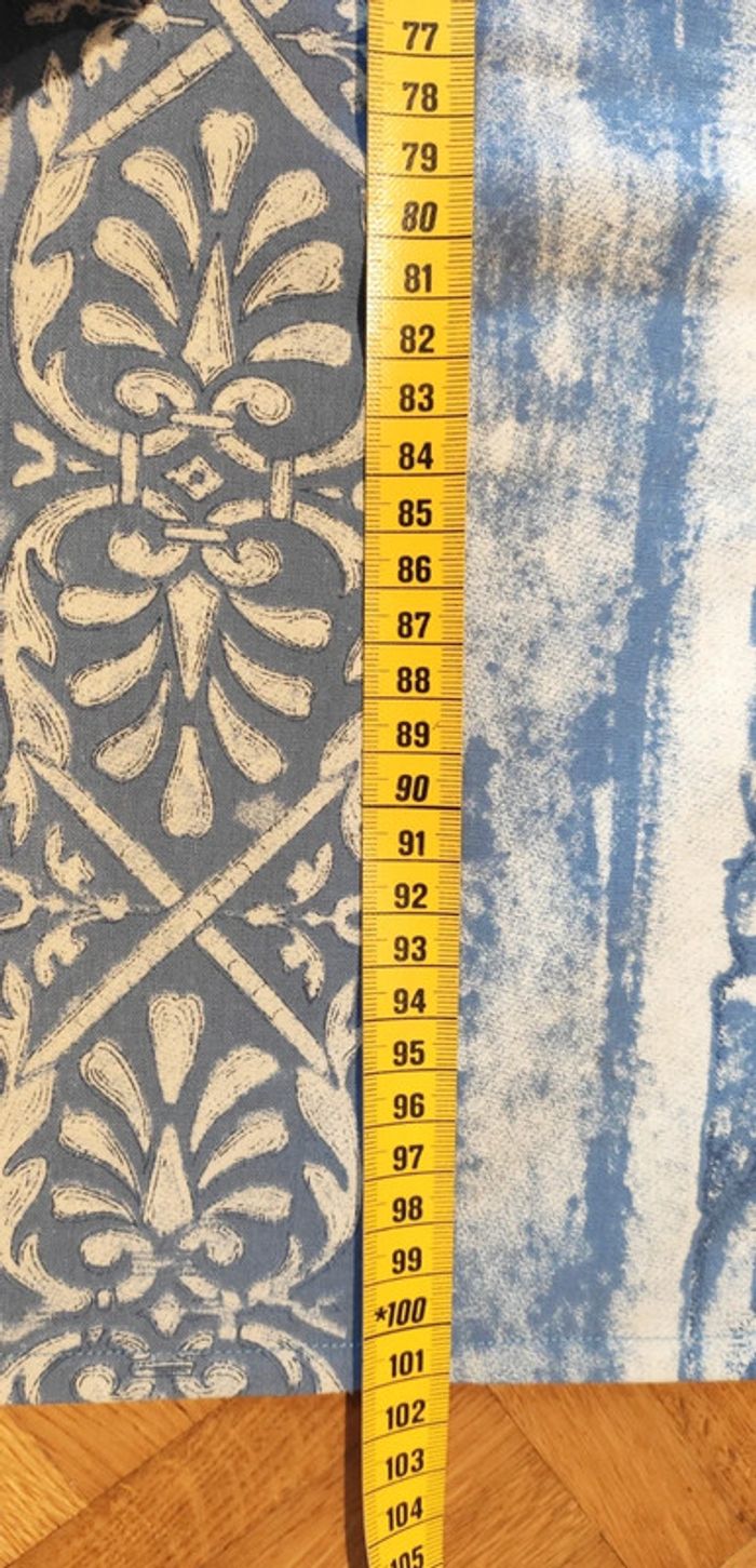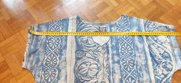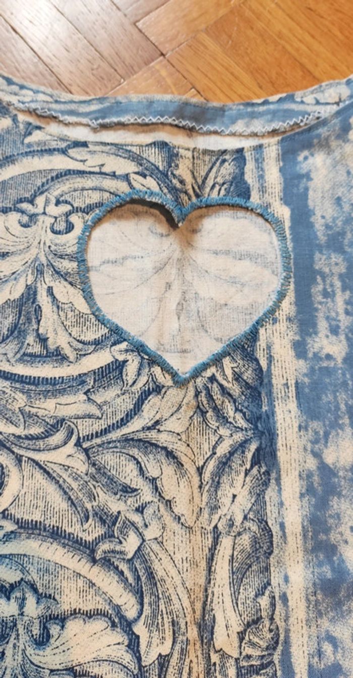 Robe modèle unique. Tissu blanc et bleu avec petit cœur au décolleté. Aisselles à aisselles 58cm Manche à manche 72cm Longueur 101cm