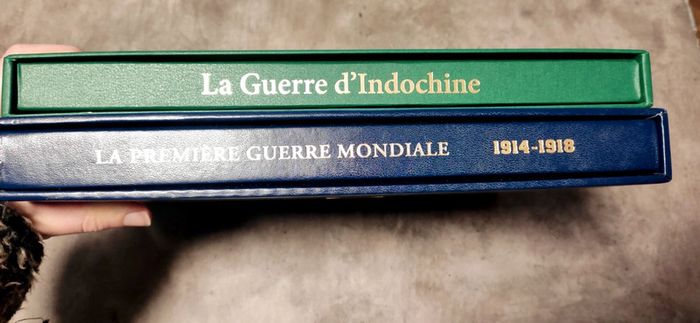 Coffret guerre d'Indochine : Revivez en 300 pages, avec plus de 450 photos – dont certaines en couleur – ainsi que de nombreuses cartes et documents d’époque, issus d’archives civiles, militaires et de collections privées, l’intégralité de la Guerre d’Indochine. Les textes ont été rédigés par les meilleurs spécialistes et historiens, dans un style vivant et accessible à tous ! Retrouvez également les grandes figures politiques et militaires (les généraux : Leclerc, de Lattre de Tassigny, Bigeard…), qui ont pris part à ce conflit historique. Pour mettre en valeur et préserver ce bel ouvrage de référence, un superbe coffret Collector a été créé pour cette réédition. Parfaitement assorti à la reliure de l’ouvrage, d’un beau vert, façon cuir, il est mis en valeur par un élégant marquage doré et argenté, représentant un symbole inspiré de “la médaille de la campagne d’Indochine”. Motif allégorique au fer à dorer, que l’on retrouve également sur la couverture du livre. Nouvelle édition, limitée à 2 650 exemplaires. Introuvable en librairie. 105€ Coffret la seconde guerre mondiale: Le coffret La Première Guerre mondiale a été rédigé par des historiens, dans un style clair et accessible à tous. De grands reportages vous font revivre l’intégralité de la « Grande Guerre ». Particularité : il réunit près de 150 reproductions en couleur, des œuvres des peintres de la guerre, qui parurent dans le célèbre hebdomadaire L’Illustration, de 1914 à 1918. Cet ouvrage de référence, en édition limitée et numérotée à 4500 exemplaires seulement, est introuvable en librairie. Un coffret prestigieux, incrusté d’une superbe pièce de collection dorée à l’or fin 24 carats. 130€