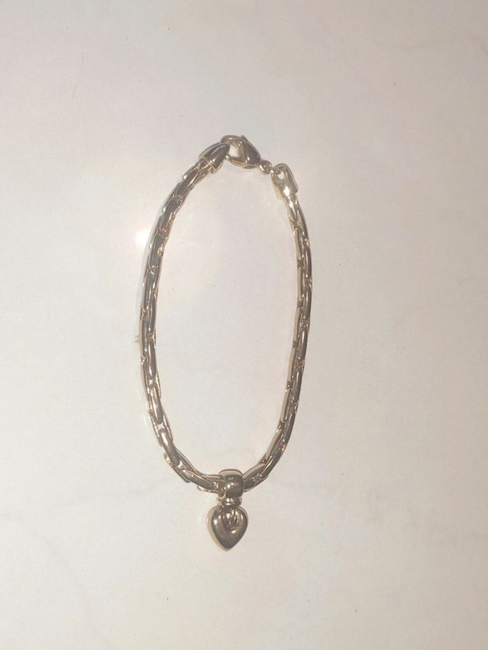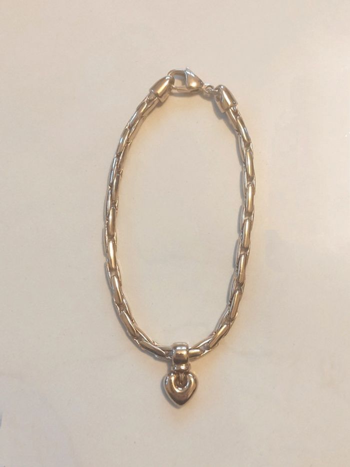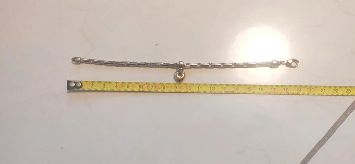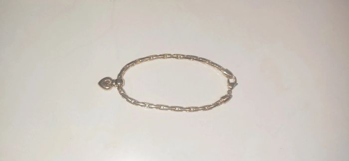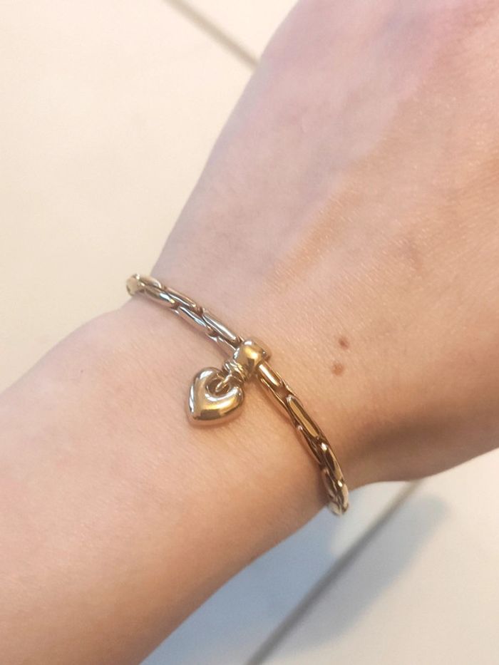 Très joli bracelet coeur, doré. Je ne connais pas la matière mais ce n'est pas de l'or. Longueur 19cm