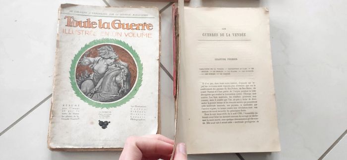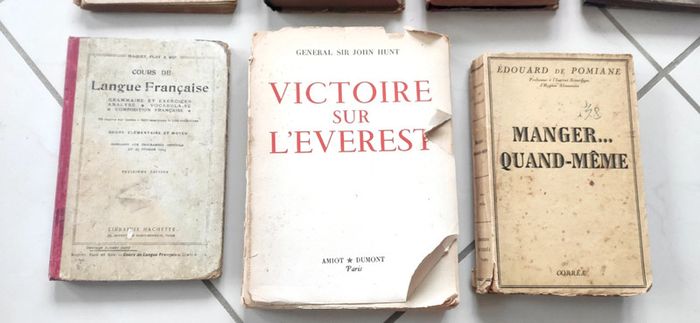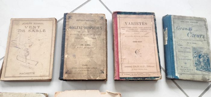 Lot de livres anciens parfois en très mauvais état malheureusement victime des décennies : - Vent de Sable 1923 5€ - Œuvres poétiques de Boileau Despréaux 1901 10€ - Variétés 1896 - 1897 10€ - Grands coeurs 1910 10€ - Cours de Langue Française 1923 10€ - Victoire sur l'Everest 1953 (mauvais état, plus de tranche et 1ere page détachée) 5€ - Manger...quand même 1941 13€ - Toute la guerre illustrée en un volume 1920 (mauvais état, plus de tranches et pages de détachent, mais rare, je ne le trouve pas ailleurs) 10€ - Les guerres de la Vendée (pas de date, plus de première page et tranches très abîmée. Mais pas en dessous de 30€ sur le net). 8€
