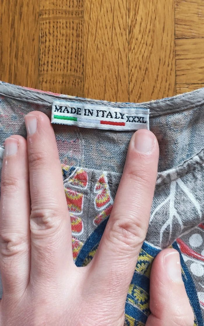 Robe en lin, longueur 95cm, taille 54cm, aisselles à aisselles 54cm. 100% lin, 95% coton et 5% elasthanne.