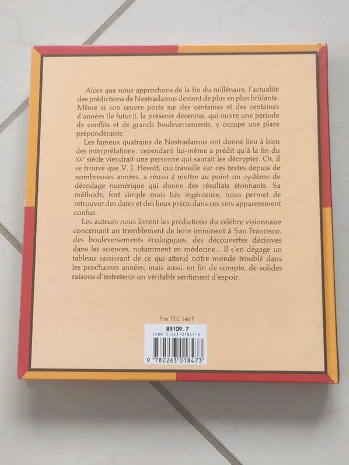 Alors que nous approchons de la fin du millénaire, l'actualité des prédictions de Nostradamus devient de plus en plus brûlante. Même si son oeuvre porte sur des centaines et des centaines d'années (le futur !), la présente décennie, qui ouvre une période de conflits et de grands bouleversements, y occupe une place prépondérante. Les fameux quatrains de Nostradamus ont donné lieu à bien des interprétations ; cependant, lui-même a prédit qu'à la fin du XXe siècle viendrait une personne qui saurait les décrypter. Or, il se trouve que V.J. Hewitt, qui travaille sur ces textes depuis de nombreuses années, a réussi à mettre au point un système de décodage numérique qui donne des résultats étonnants. Sa méthode, fort simple mais très ingénieuse, nous permet de retrouver des dates det des lieux précis dans ces vers apparemment confus. Les auteurs nous livrent les prédictions du célèbre visionnaire concernant un tremblement de terre imminent à San Francisco, des bouleversements écologiques, des découvertes décisives dans les sciences, notamment en médecine... Il s'en dégage un tableau saisissant de ce qui attend notre monde troublé dans les prochaines années, mais aussi, en fin de compte, de solides raisons d'entretenir un véritable sentiment d'espoir.