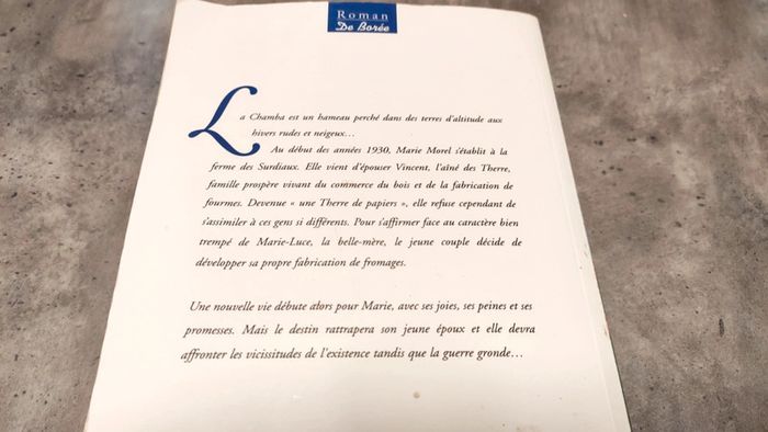 La Chamba est un hameau perché dans des terres d'altitude aux hivers rudes et neigeux... Au début des années 1930, Marie Morel s'établit à la ferme des Surdiaux. Elle vient d'épouser Vincent, l'aîné des Therre, famille prospère vivant du commerce du bois et de la fabrication de fourmes. Devenue " une Therre de papiers ", elle refuse cependant de s'assimiler à ces gens si différents. Pour s'affirmer face au caractère bien trempé de Marie-Luce, la belle-mère, le jeune couple décide de développer sa propre fabrication de fromages. Une nouvelle vie débute alors pour Marie, avec ses joies, ses peines et ses promesses. Mais le destin rattrapera son jeune époux et elle devra affronter les vicissitudes de l'existence tandis que la guerre gronde...