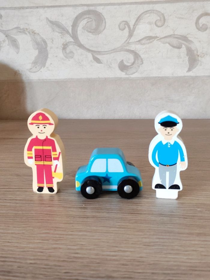 Petites figurines en bois, pompier, gendarme et petite voiture bleue
