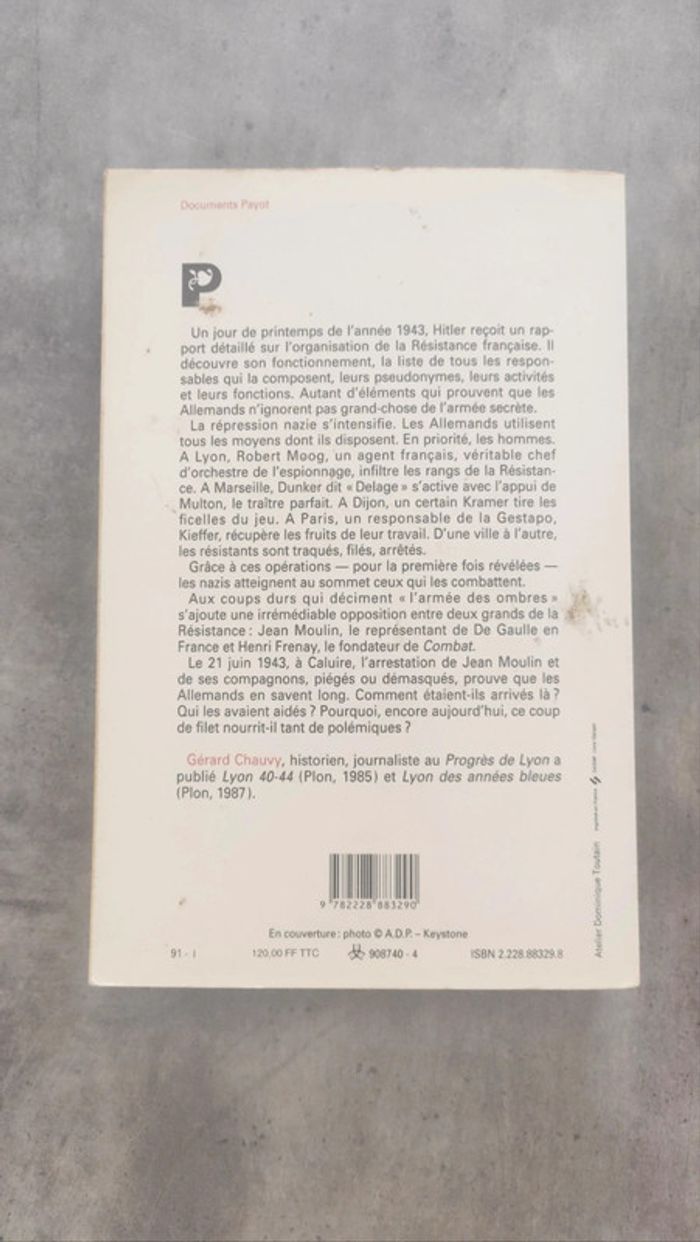 "Un jour de printemps de l'année 1943, Hitler reçoit un rapport détaillé sur l'organisation de la Résistance française. Il découvre son fonctionnement, la liste de tous les responsables qui la composent, leurs pseudonymes, leurs activités et leurs fonctions. Autant d'éléments qui prouvent que les Allemands n'ignorent pas grand chose de l'armée secrète. La répression nazie s'intensifie. Les Allemands utilisent tous les moyens dont ils disposent. En priorité, les hommes. A Lyon, Robert Moog, un agent français, véritable chef d'orchestre de l'espionnage, infiltre les rangs de la Résistance. A Marseille, Dunker dit " Delage " s'active avec l'appui de Multon, le traître parfait. A Dijon, un certain Kramer tire les ficelles du jeu. A Paris, un responsable de la Gestapo, Kieffer, récupère les fruits de leur travail. D'une ville à l'autre, les résistants sont traqués, filés, arrêtés. Grâce à ces opérations -pour la première fois révélées- les nazis atteignent au sommet ceux qui les combattent. Aux coups durs qui déciment " l'armée des ombres " s'ajoute une irrémédiable opposition entre deux grands de la Résistance : Jean Moulin, le représentant de De Gaulle en France et Henri Frenay, le fondateur de Combat. Le 21 juin 1943, à Caluire, l'arrestation de Jean Moulin et de ses compagnons, piégés et démasqués, prouvent que les Allemands en savent long. Comment étaient-ils arrivés là ? Qui les avaient aidés ? Pourquoi, encore aujourd'hui, ce coup de filet nourri-t-il tant de polémiques ?"