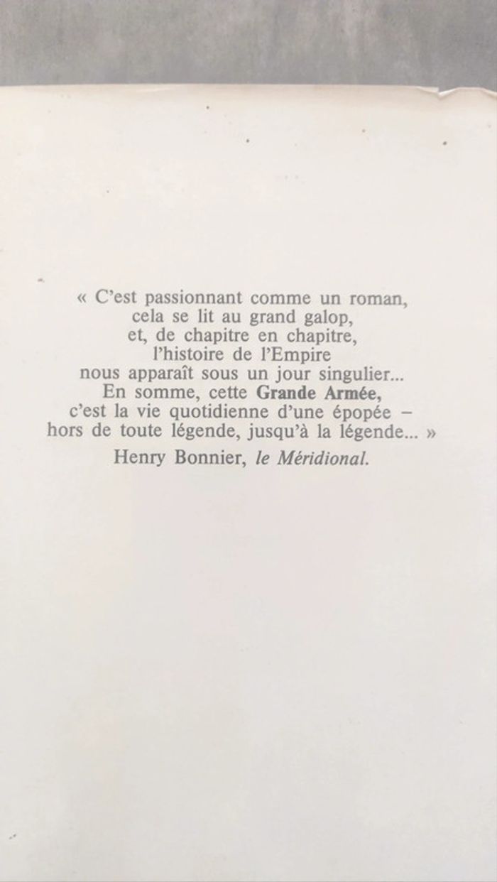 Le Tondu » disaient-ils, gagne ses guerres avec nos jambes ». Et tous, des Maréchaux aux jeunes conscrits, ils marchaient et, harassés, ils combattaient et longtemps ils volèrent de victoire en victoire, râlant, pillant, massacrés et massacrant, acclamés et détestés, héros et martyrs, fascinés par le génie et le destin d’un homme, leur général, leur chef, leur « père », l’Empereur NAPOLEON. Du Camp de Boulogne en 1804 jusqu’à Moscou, jusqu’à la terrible «  retraite » de 1812 et jusqu’à l’ultime acte de Waterloo ou s’accomplit le destin dans une dernière exaltation héroïque ou la victoire faillit encore une fois leur sourire. Jamais comme dans ce grand livre d’histoire on n’avait encore décrit la vie de ces hommes levés dans l’Europe entière: LA GRANDE ARMEE, dans son odeur forte et dans sa brutalité, dans sa misère et dans son héroïsme, dans son courage et dans son immense gloire devenue immortelle ». Avec ce volumineux ouvrage Georges BLOND a écrit une remarquable, très vivante et très complète histoire de la Grande Armée. Et plus encore une histoire des soldats de NAPOLEON basée sur une documentation extrêmement rigoureuse. Un grand livre, dense mais magnifiquement écrit grâce au talent de plume de l’auteur, qui reste incontournable pour tous les amateurs d’histoire militaire napoléonienne.