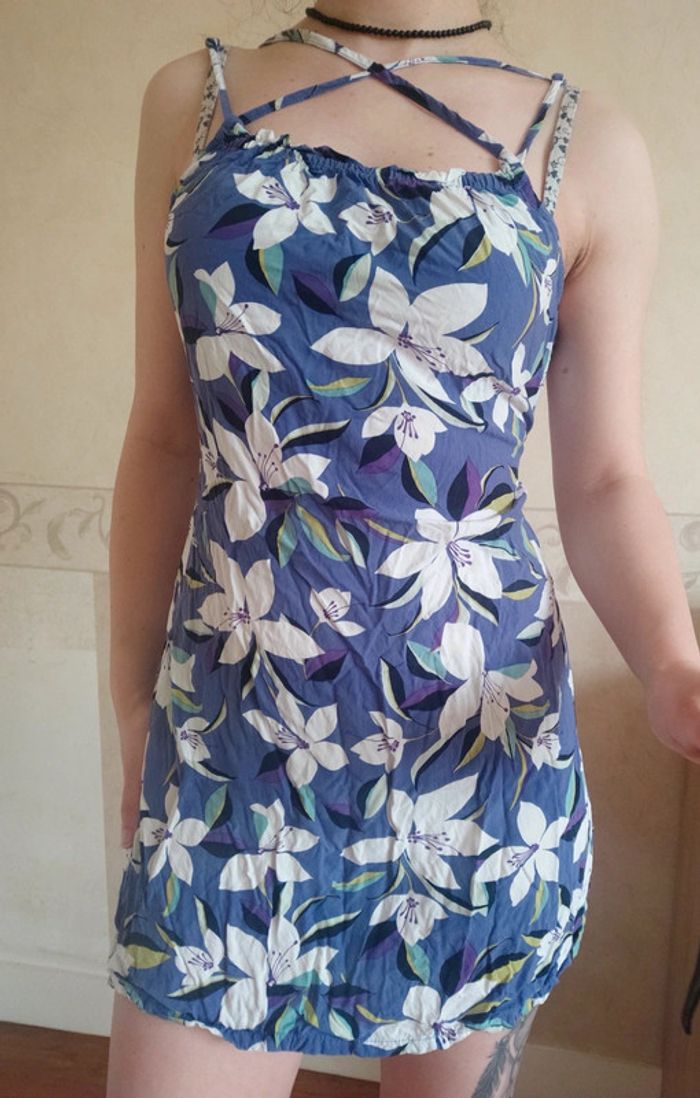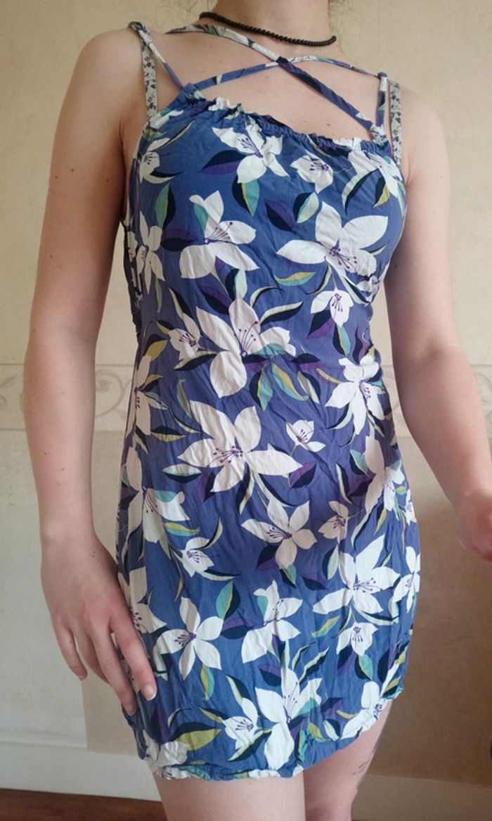 Superbe petite robe de plage avec dos nu Fleurs blanches et lanières décolleté Fluide et agréable à porter pour l'été Étiquette juste enlevée, portée juste pour la photo