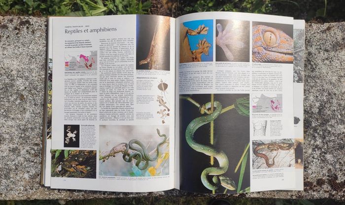 Ce bel album nous montre les animaux dans leur environnement naturel, ex.: régions polaires, prairies, déserts, forêts, montagnes, îles, océans. A chaque page, des exemples d'adaptations retiennent l'attention. Notions de classification, p. 372-421.