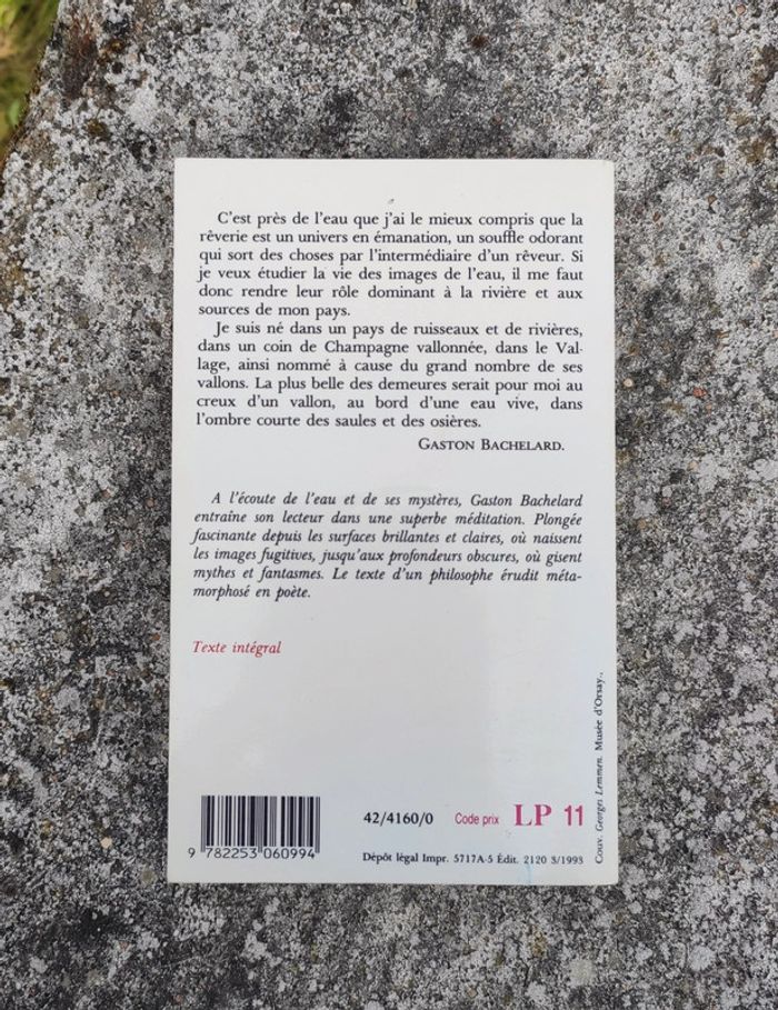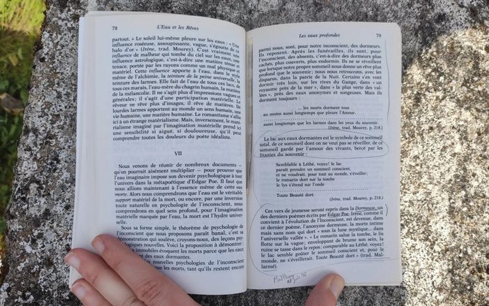 Le philosophe met en lumière l'imagination matérielle, la profondeur et l'élan de la matière. Au delà de la forme dont elle se pare ; la poésie naît au coeur du rêve qui vit, depuis toujours, dans les entrailles du monde. Le poète en extrayant sa substance fait apparaître la beauté naturelle. Quelques passages soulignés (voir photos)