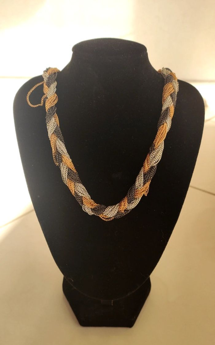 Joli collier chaîne tressé Noir argenté et doré (quelques brins dépassent, voir photo. Peut être réparé) Vintage