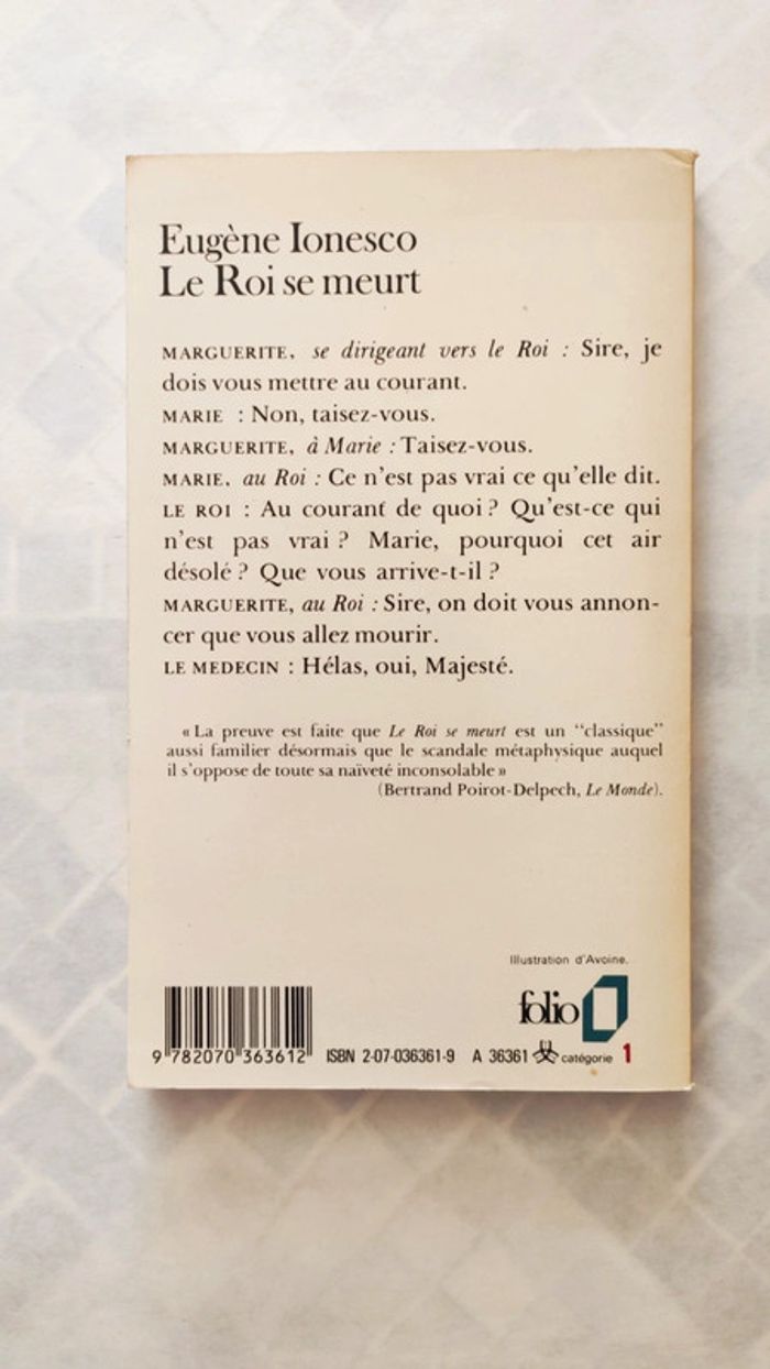 Livre le Roi se meurt Bérenger entre les pieds nus et se plaint de l'état de l'Univers, du Royaume et de sa santé. Son médecin ne lui laisse aucun espoir, mais le roi refuse d'admettre l'évidence. Il veut mourir quand il l'aura décidé, quand il l'aura accepté. Il refuse, se révolte, et finit par accepter son destin.