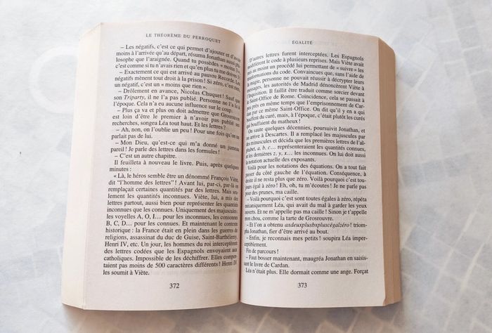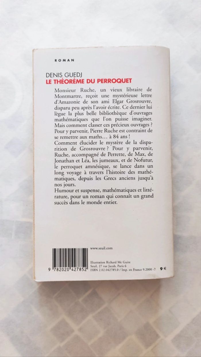 Livre le théorème du perroquet L'histoire se déroule à Montmartre, rue Ravignan[2]. Pierre Ruche (πR) est un vieux libraire cloué dans un fauteuil roulant. Il est aidé par Perrette Liard qui élève seule trois enfants : les jumeaux Jonathan-et-Léa, et le dernier Max, un enfant sourd. La vie de tout ce petit groupe va être bouleversée par deux événements : l'entrée dans la famille d'un perroquet, Nofutur, que Max sauve des mains de personnages douteux ; l'arrivée d'une lettre du Brésil (Manaus) provenant d'Elgar Grosrouvre, un ami d'enfance de Pierre, féru de mathématiques, qui lui confie la totalité de sa bibliothèque ainsi qu'une énigme à résoudre. À travers les fiches laissées par Grosrouvre, Pierre Ruche va découvrir la richesse des mathématiques de l'époque grecque jusqu'à nos jours. Ses recherches le mèneront de la Bibliothèque nationale de France (BnF) à l’Institut du monde arabe (IMA), en passant par la pyramide du Louvre[2]. Il partage ses découvertes avec Max et les jumeaux qui vont eux aussi finir par se prendre au jeu. Mais quel rapport y a-t-il entre la mort de Grosrouvre, sa bibliothèque et le perroquet Nofutur ?