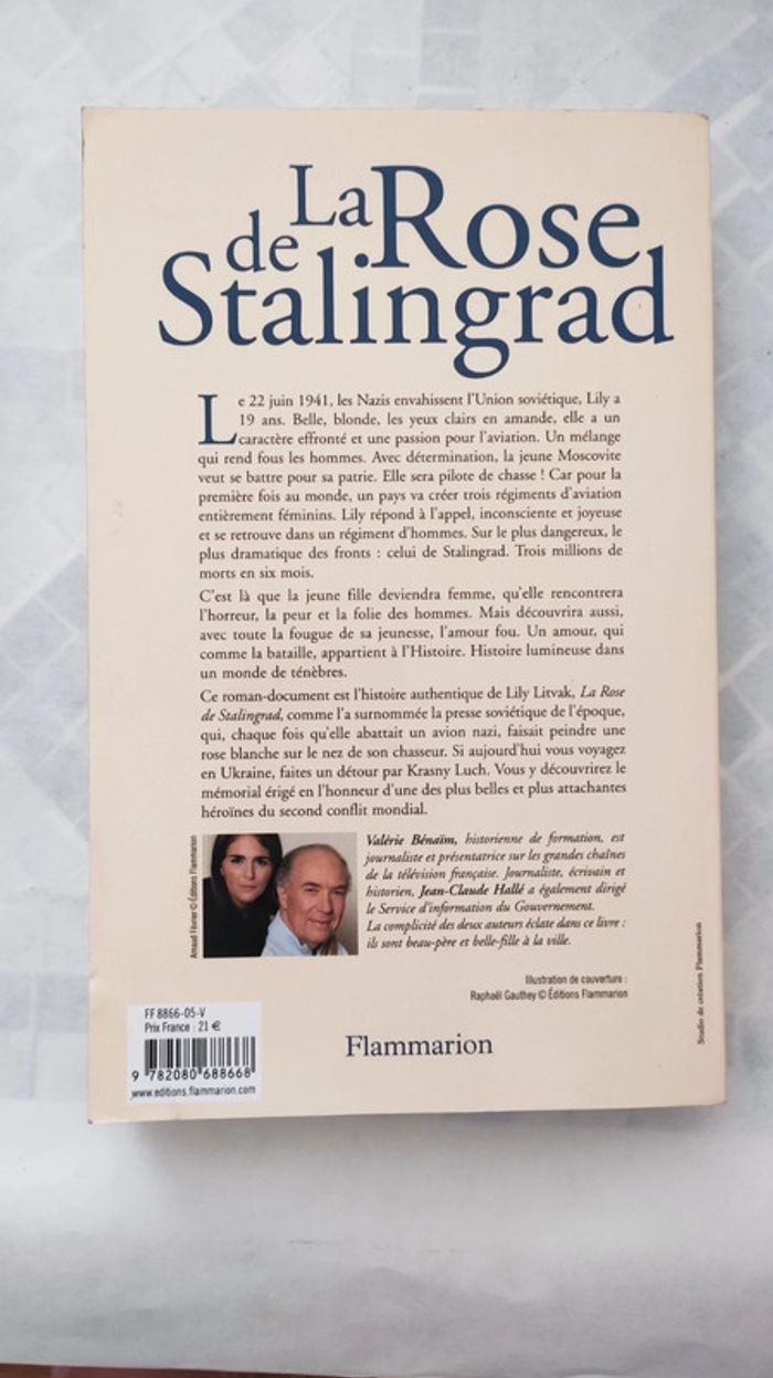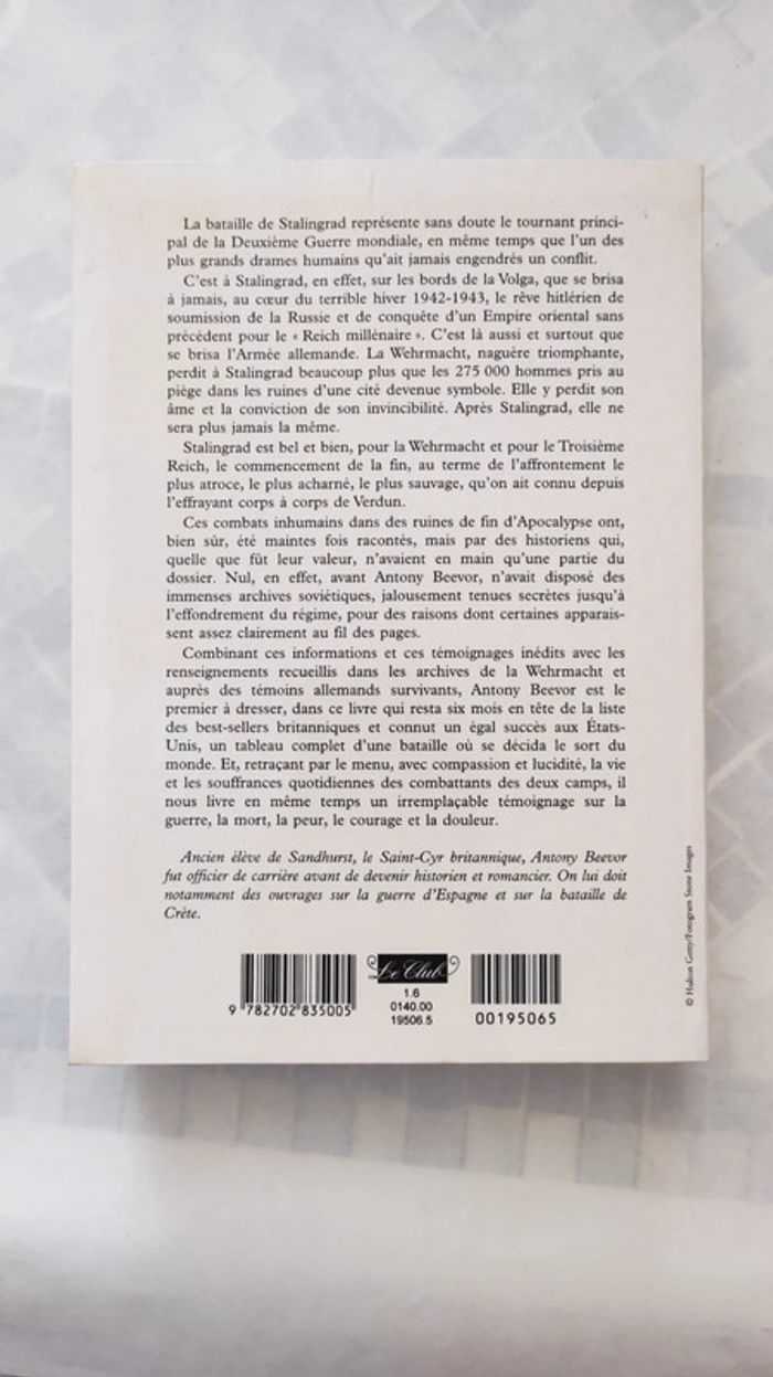 Deux livres: - Stalingrad, Antony Beevor 8€ Les causes de la défaite de l'armée allemande (la Wehrmacht) durant la Seconde Guerre mondiale, au cours de la bataille de Stalingrad de l'hiver 1942-1943. Ce combat perdu fut le commencement de la fin du rêve hitlérien et du Troisième Reich. - la rose de Stalingrad 5€ Roman historique, cet ouvrage raconte l'histoire de Lily Litvak, jeune fille de dix-sept ans, qui se porte volontaire pour être pilote de guerre alors que les troupes allemandes d'Hitler entrent dans Moscou.