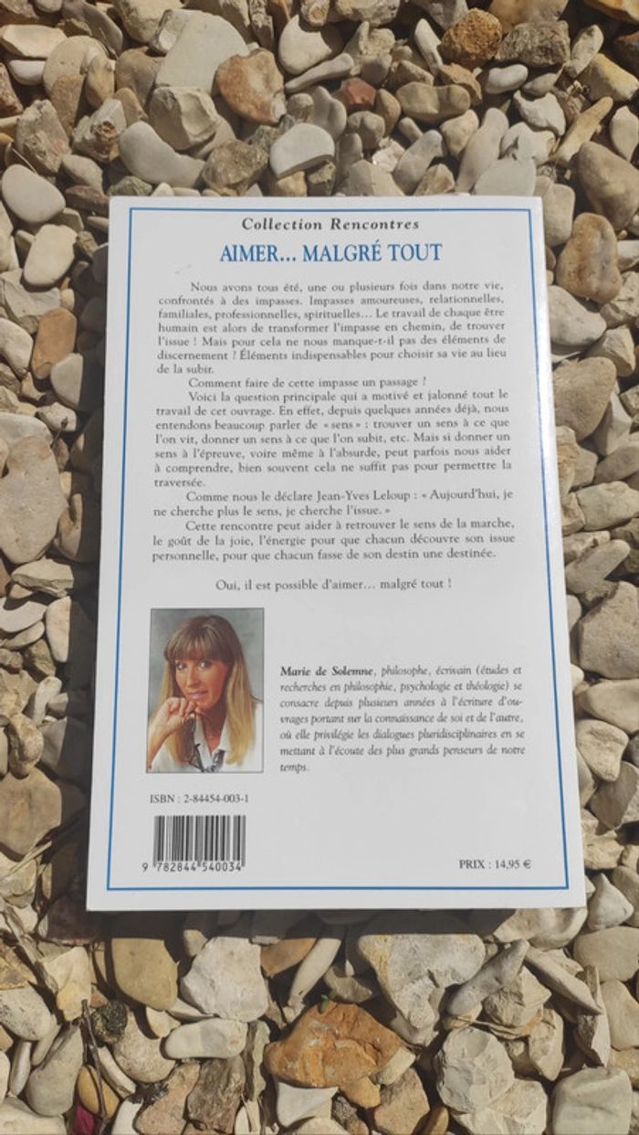 Très joli livre "Aimer...malgré tout" rencontre avec Marie de Solemne écrivain et philosophe. Comment surmonter les impasses de la vie et trouver notre issue? Valeur: 14,95Euro(s)