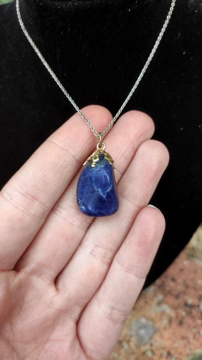 Collier ornée d'une pierre semi précieuse de sodalite. Vertus et bienfaits de la Sodalite: apporterait amour et confiance en soi réduirait les ulcères et l’hypertension apaiserait le stress faciliterait la respiration favoriserait l’endormissement contribuerait à réduire les maux de tête régénèrerait la peau
