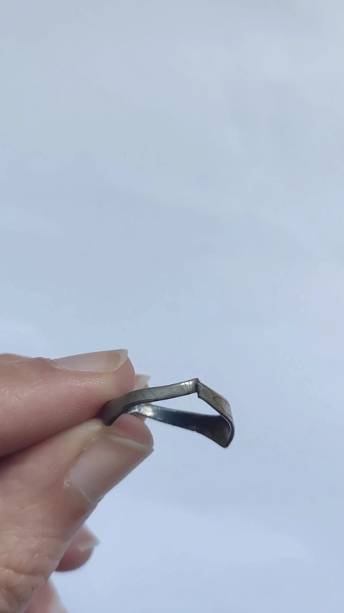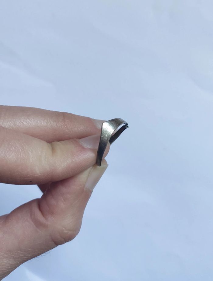 Bague argenté, je ne connais pas la matière, aucun poinçon. Cassé au niveau d'un côté (voir photo). Ancienne. D'après quelques indications, il s'agirait peut être d'une bague de poilu, créé lors de la première guerre mondiale, elle serait donc en alu.