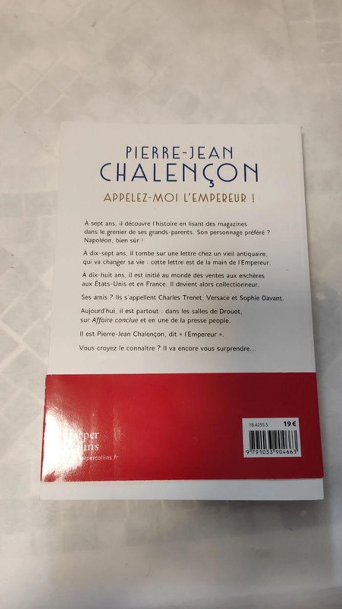 À sept ans, il découvre l’histoire en lisant des magazines dans le grenier de ses grands-parents. Son personnage préféré ? Napoléon, bien sûr ! À dix-sept ans, il tombe sur une lettre chez un vieil antiquaire, qui va changer sa vie : cette lettre est de la main de l’Empereur. À dix-huit ans, il est initié au monde des ventes aux enchères aux États-Unis et en France. Il devient alors collectionneur. Ses amis ? Ils s’appellent Charles Trenet, Versace et Sophie Davant. Aujourd’hui, il est partout : dans les salles de Drouot, sur Affaire conclue et en une de la presse people. Il est Pierre-Jean Chalençon, dit « l’Empereur ». Vous croyez le connaître ? Il va encore vous surprendre... État neuf, valeur 19€