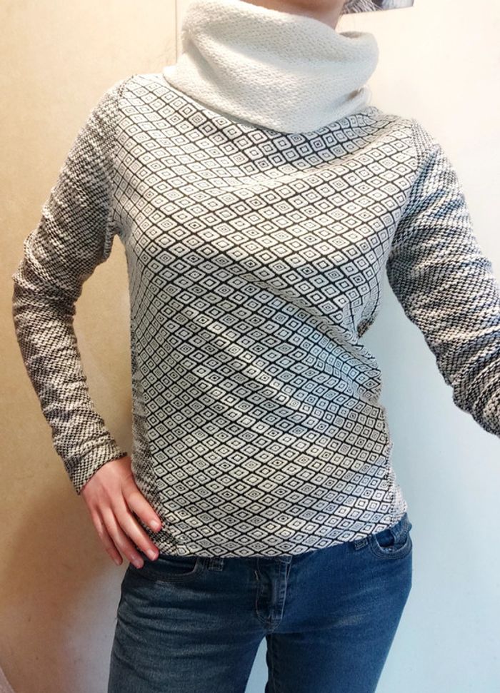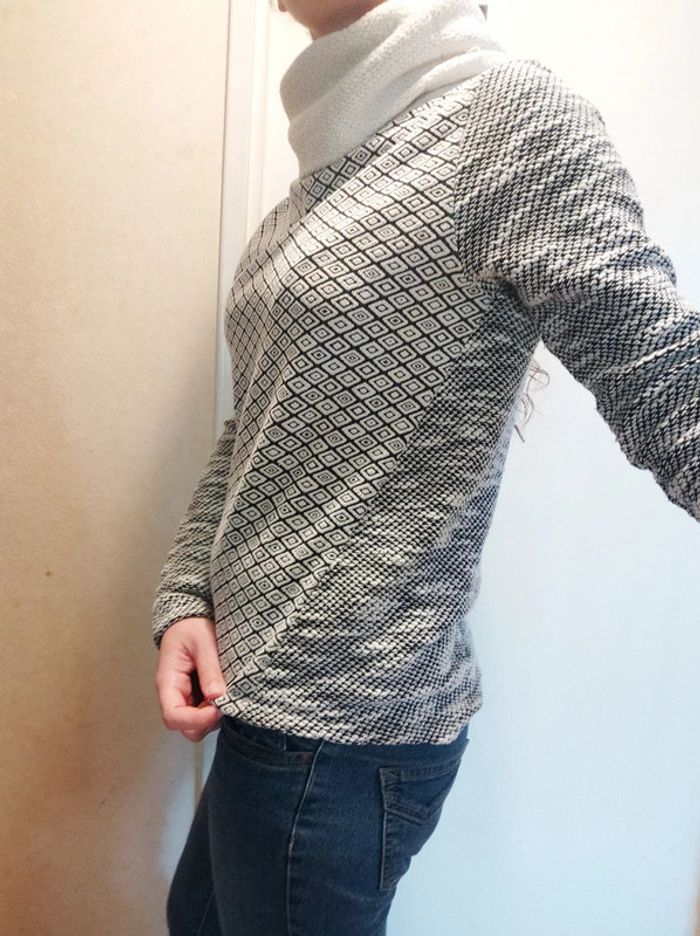 Pull original col roulé, peu se porter d'un côté ou de l'autre car motifs différents. Tien chaud