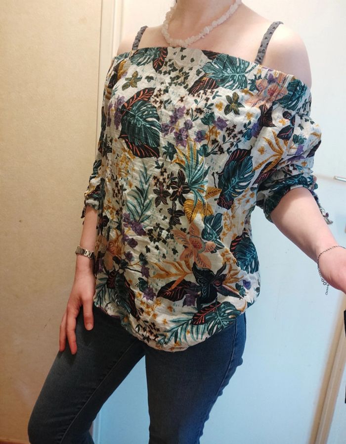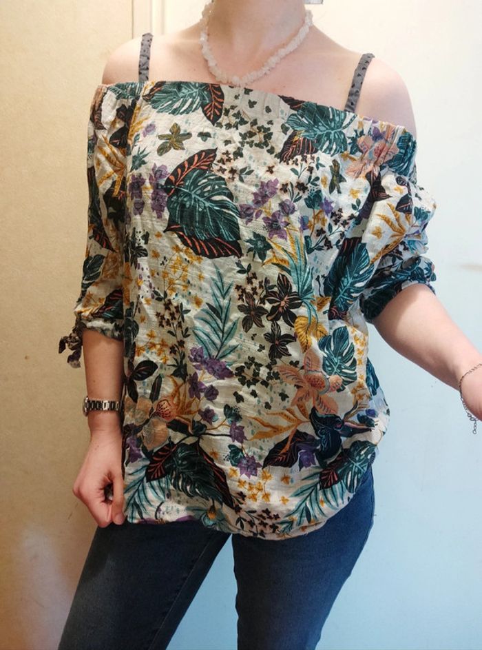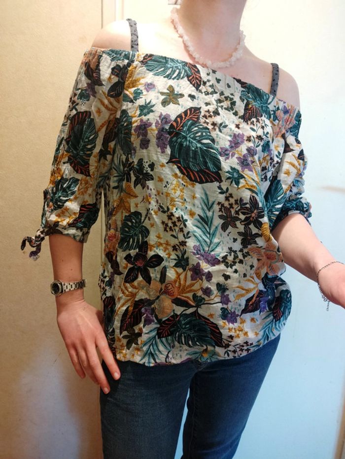 Superbe petit haut épaules dénudées Motif fleurs, fleuri style vintage Manches 3/4