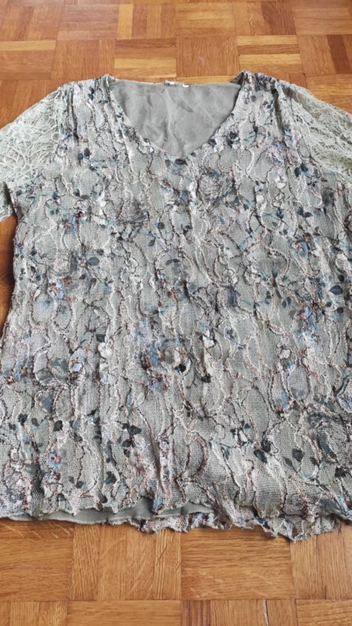 T-shirt dentelle bleu et beige - photo numéro 1