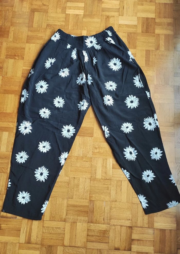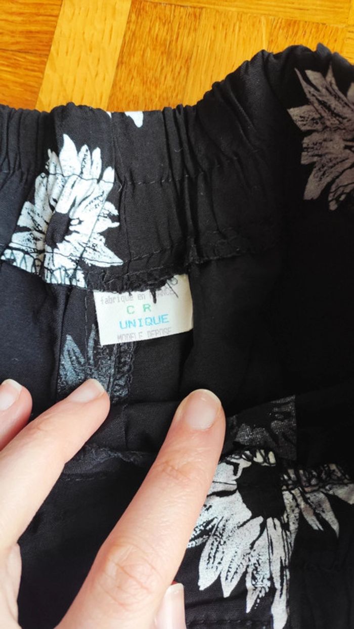 Pantalon large noir et blanc avec fleurs, taille unique. Fabriqué en France